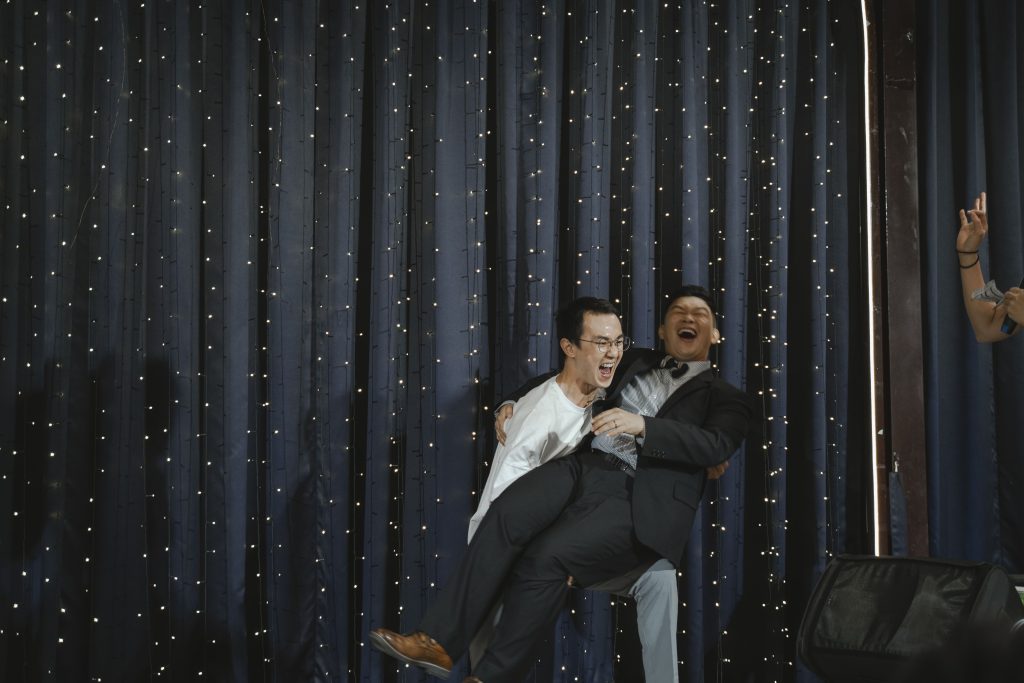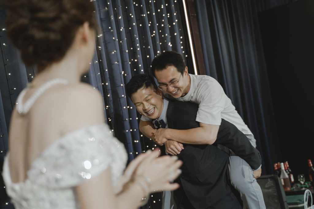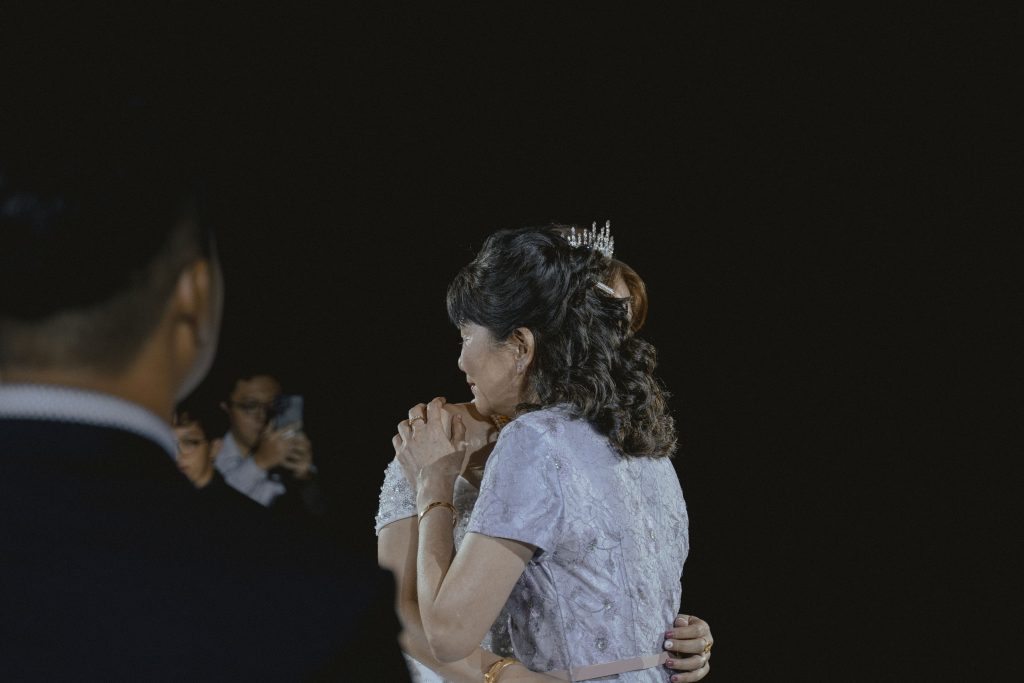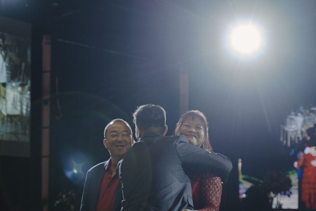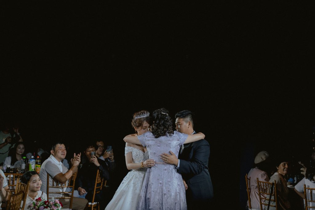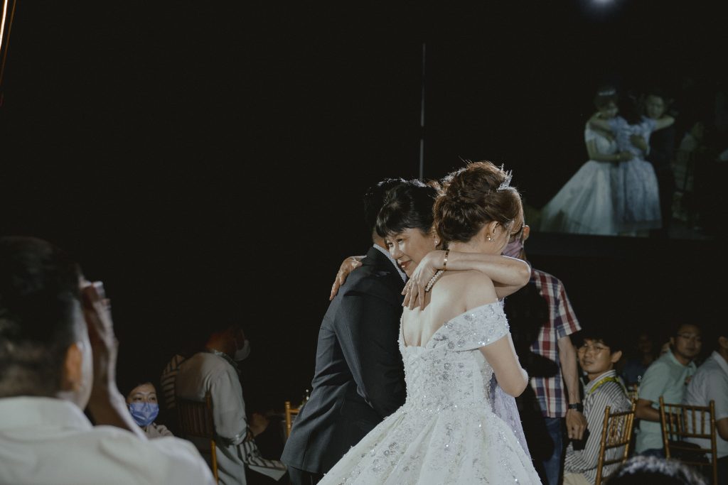 相對於新娘多數的交手環節,我近年也常常在婚禮安排新郎的擁抱環節。亞洲社會裡男生被教導不能哭、不能軟弱,即使社會進步了,有些根深蒂固的形象還需要時間去慢慢改變。彩排的時候,我也沒有省下這個環節(有時候會看每個人情況決定要讓流程提前被家長知道與否),SB的爸媽都是非常海派大方的人,多數這樣的人在人多且情感豐沛的場合裡,容易想逃XD,所以彩排的時候將擁抱彩進去,媽媽一臉:幹嘛要擁抱的臉,我真的笑哭(。◕∀◕。)