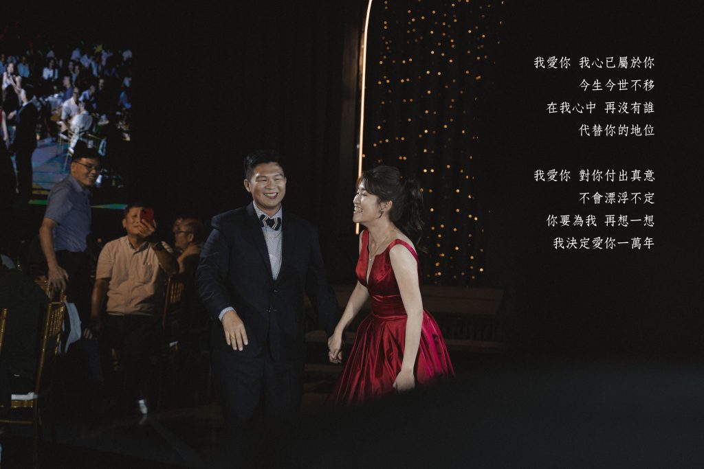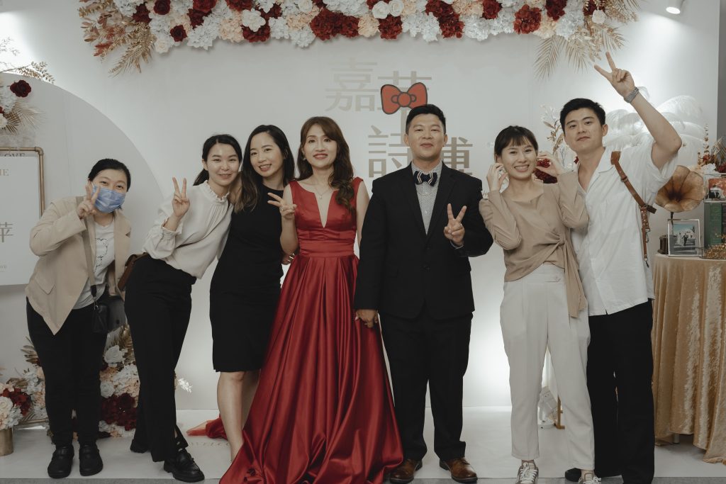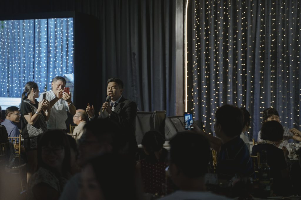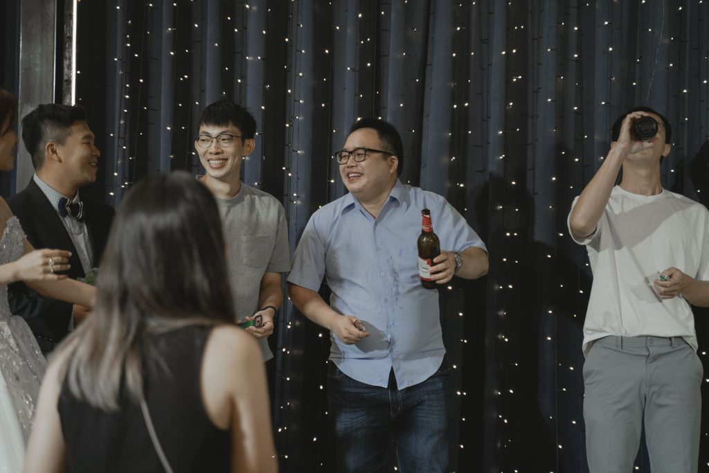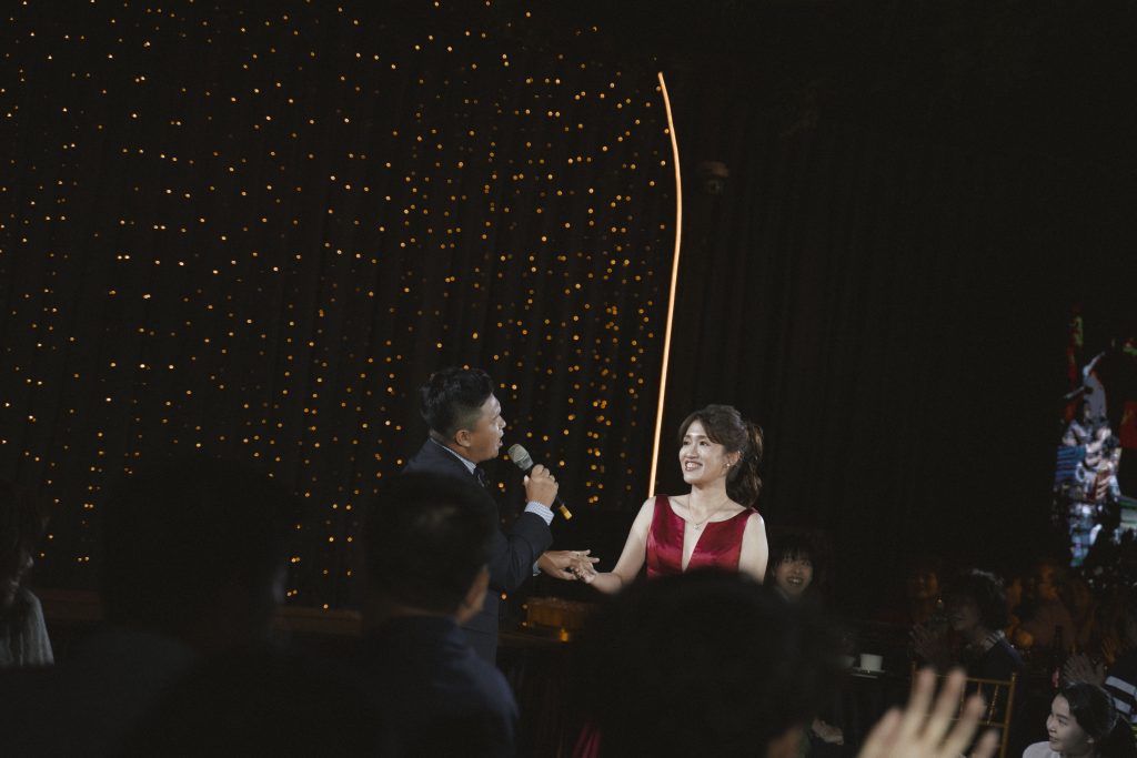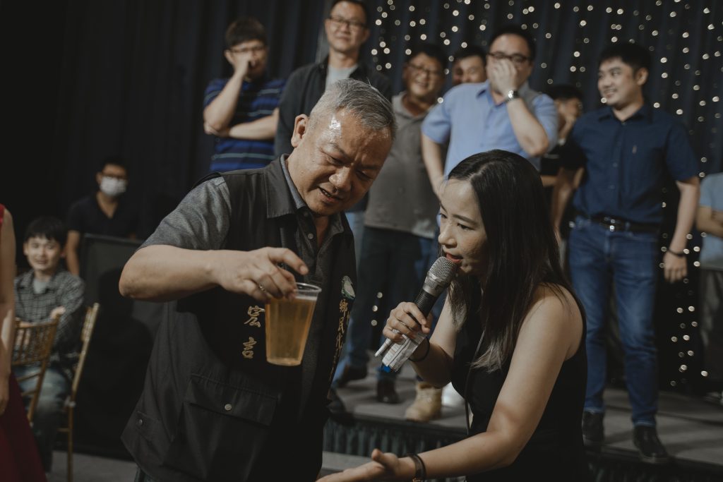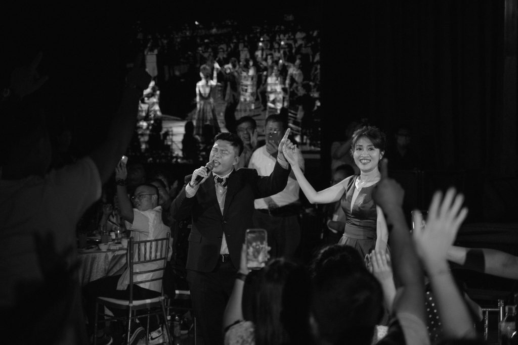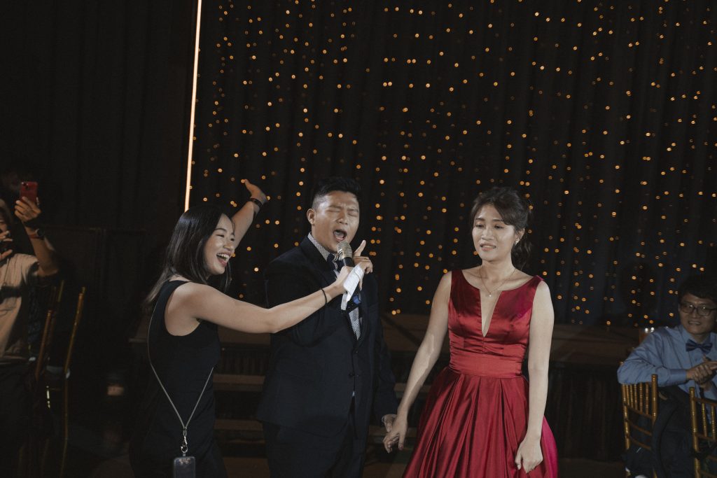 看照片就能知道新郎本人有多陶醉在個人演唱會的部分,賓客也很懂看演唱會要投入幾分,該合唱幫忙合唱、該尖叫就尖叫,婚禮結束還有賓客幫忙剪演唱會紀錄片 (´▽`),最好笑的其實準備要介紹他唱歌的時候,我一時混沌搞混了伍佰跟陳昇XD,意外在演唱前鬧一個笑話,但SB的搞笑回覆,突然氣氛在他開口唱前又變得沒那麼緊張了。