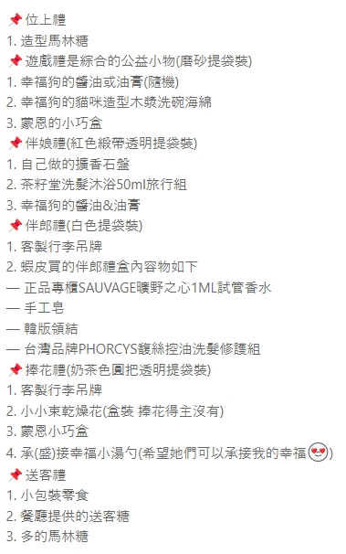婚禮當天你們可能都會很忙,禮物、道具給場地方或團隊之後,如果沒有時間跟我們對點的話,前面提供清楚的清單給我們是快速我們可以直接辨認哪些禮物在哪個時間點發放,也可以備註上一些準備禮物的原因,這樣在婚禮上主持也能同步跟姊妹們分享這個寓意。