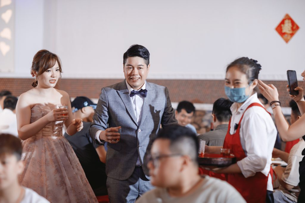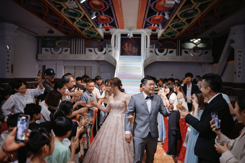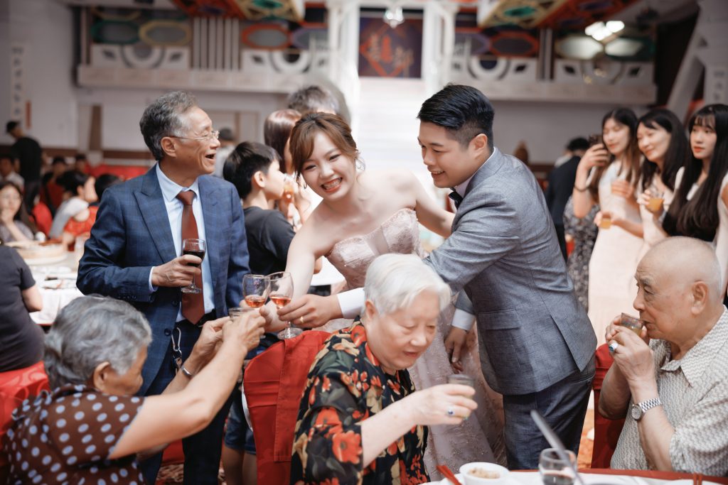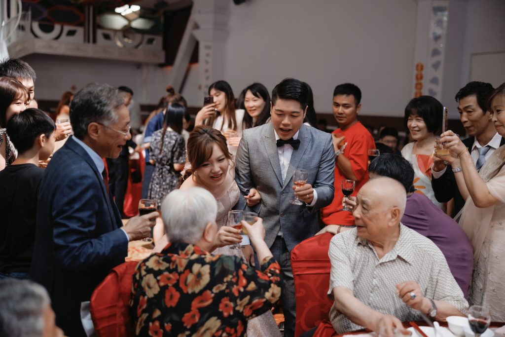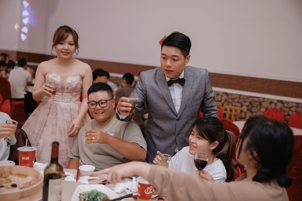 Ting & Huien 在討論過程裡,大概不只一次問過賓客的感受,甚至也因為朋友更動了不少流程的安排,連重要的進場環節也還是關心著友人們狀況,席間也是不停在詢問:大家有吃飽嗎?好吃嗎?要吃的開心哦!雖然我常常在策畫的過程,灌輸大家要以「自己」為出發,因為這場婚禮是屬於你們的,但對他們來說,也許這段旅程裡最重視的其實是一路上在不同階段裡參與著他們的家人朋友,而敲敲杯對我來說就是這樣適合他們的進場方式,因為真正愛你、在乎的人會站出來,而你也會因為重視不願意漏掉任何一位朋友家人的杯子,是雙向奔赴的關係啊!