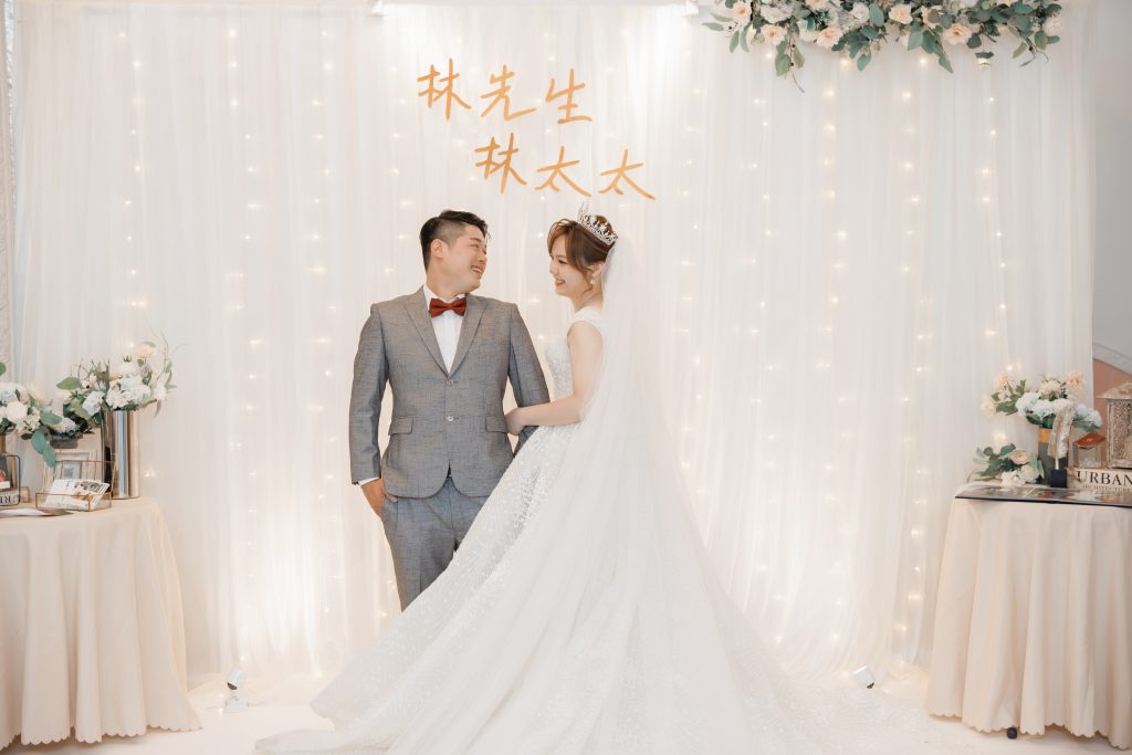 三套禮服加上兩個活動安排,Ting當天除了逐桌敬酒以外相對的自由活動的時間相當少,所以雖然選的是大裙襬的白紗,場地限制多,迎賓區比較小、大廳空調不給力,對新娘來說真的不是行動方便且舒服的環境,但當他提出想迎賓的時候,我也還是安排了(ゝ∀・) 這一年下來也大概能了解他的個性,好在新秘沙美時間抓得剛剛好,婚禮前讓他出來透透氣跟大家聊聊天,爭取更多的時間可以跟大家拍照互動,為白紗做更多的紀錄之餘,也能讓新娘更放鬆一點。