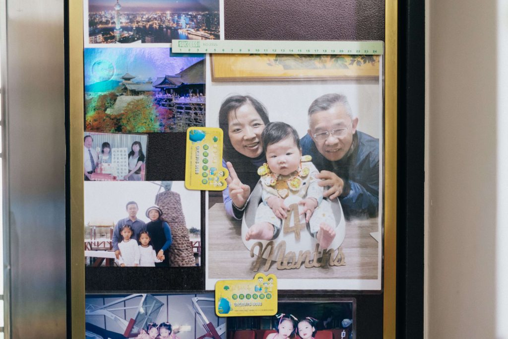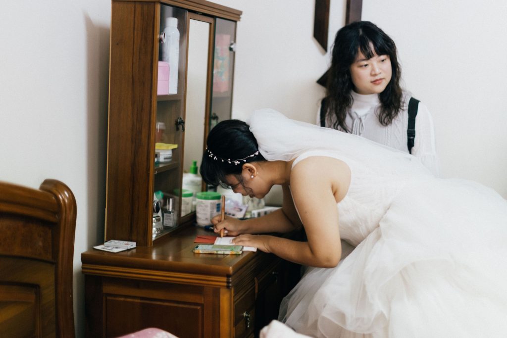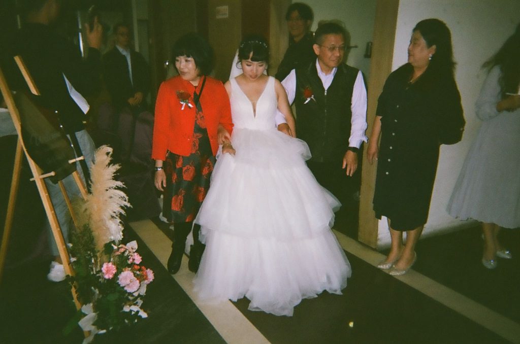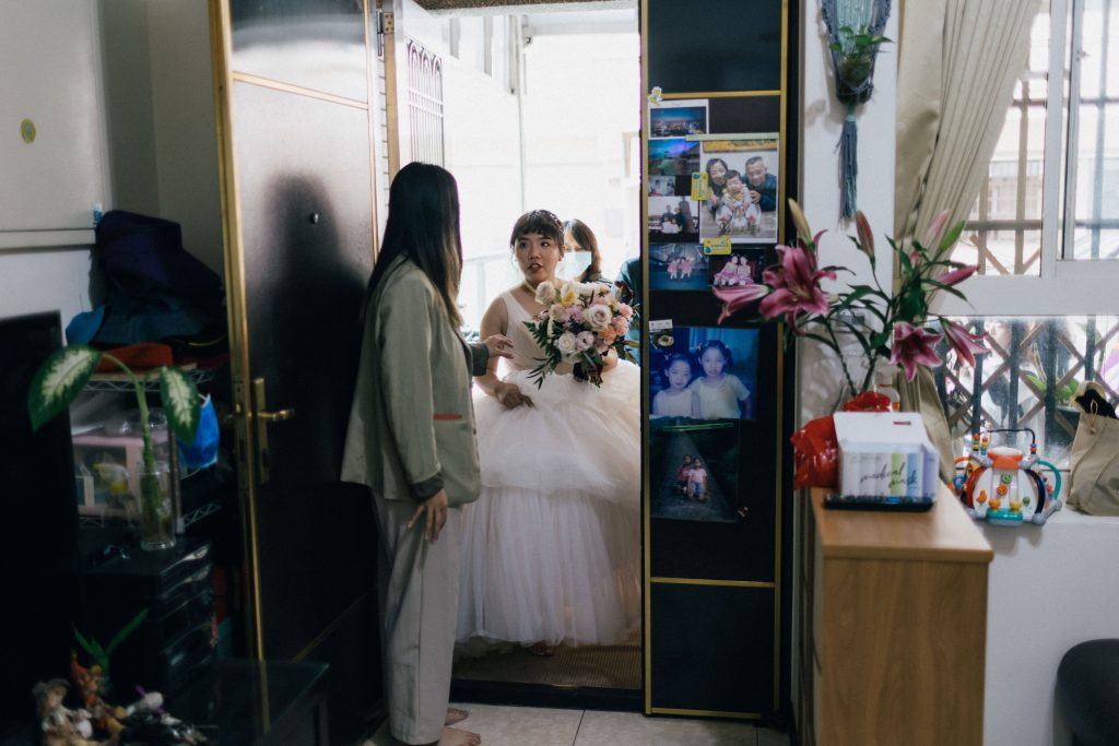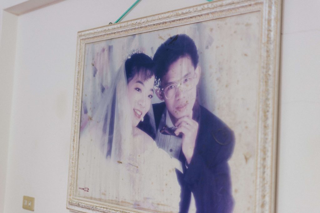 婚禮前一周我就有先來拜訪婉靖家,婉靖的家門前有個很刺的地墊,刺到我進門都要以跨海姿勢前進,進家門後印入眼簾的是溫馨的客廳,門口擺放著許多為了婚禮準備的物品,而我印象最深的是家門上貼著婉靖跟妹妹不同時期跟爸媽的合照,還小小新成員宥宥跟爺爺奶奶的合照,房間內牆上掛著爸媽結婚時的結婚照,媽媽被工作堆滿的書桌,煮出一桌好菜的那間堆得好滿的廚房,好像能明白為什麼執意想把儀式安排到家裡,那些泛黃的老照片跟熟悉的每個角落,好像隨著婚禮這一天,有了新的回憶跟紀錄。