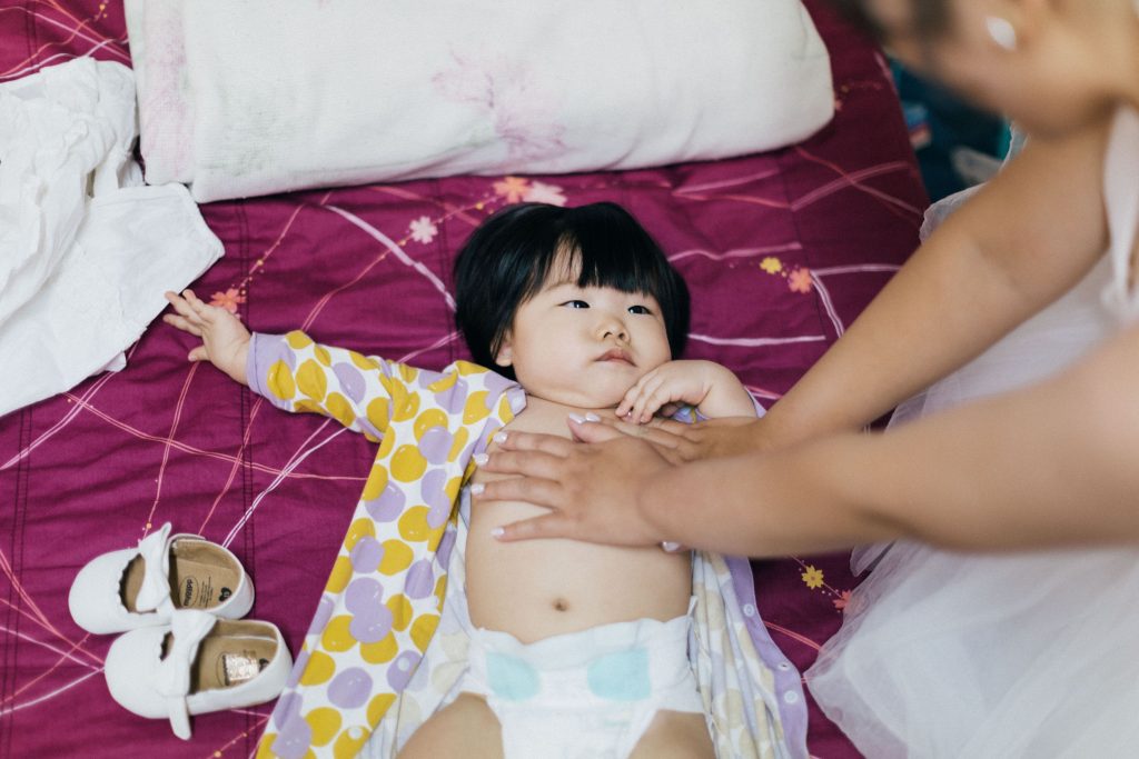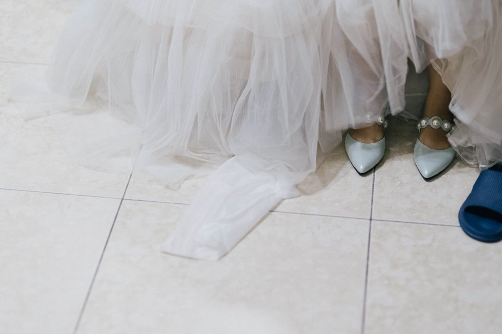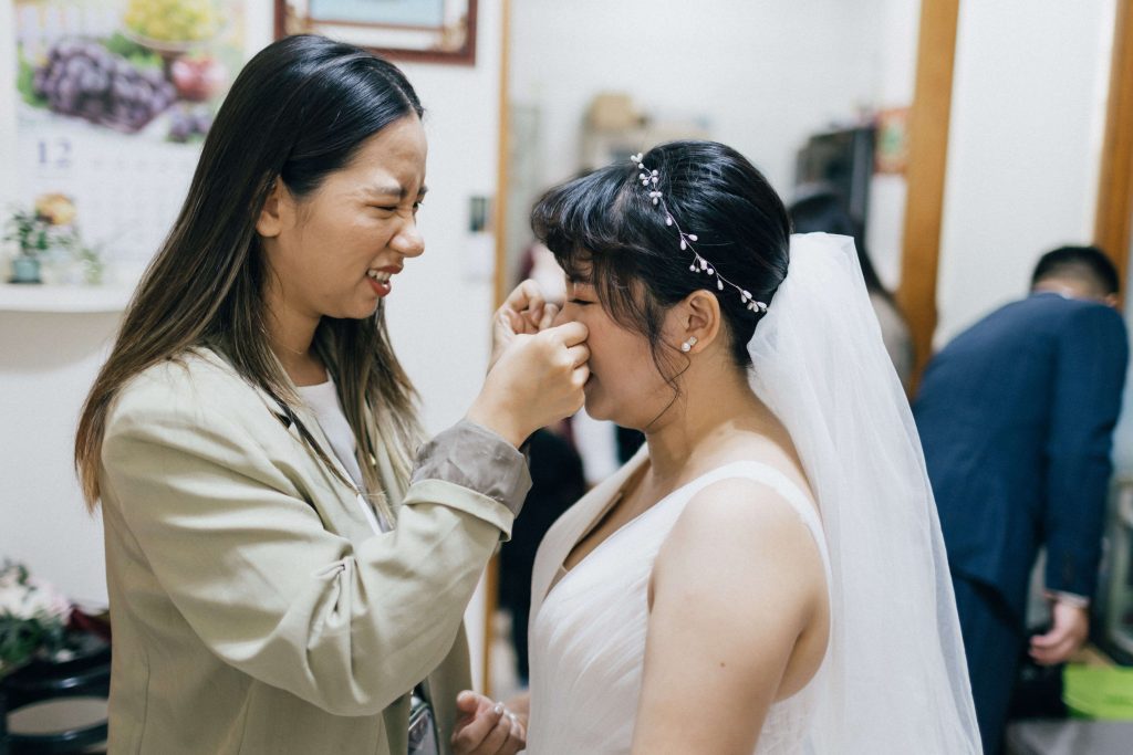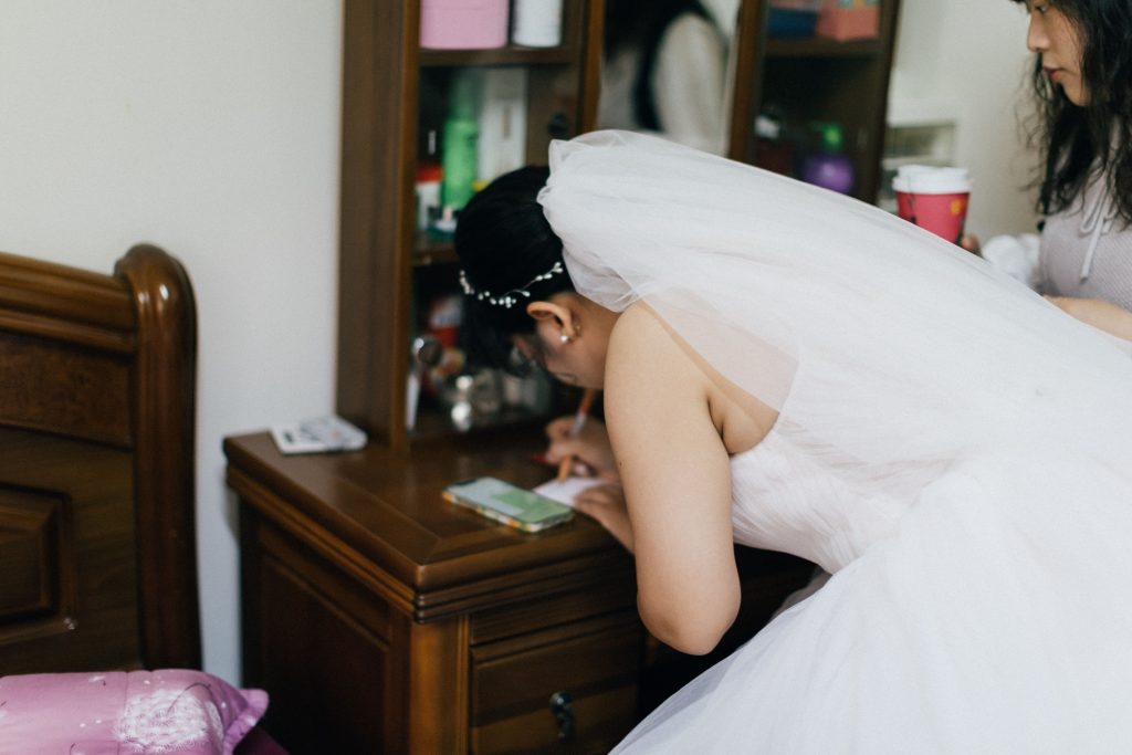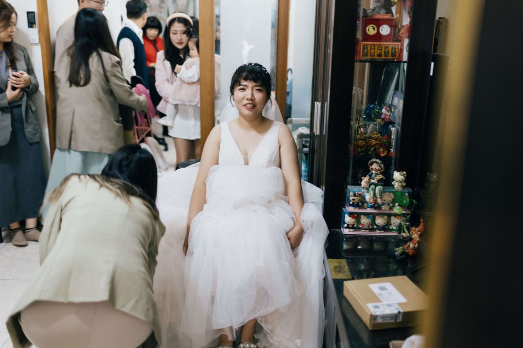 婚禮前一周我就有先來拜訪婉靖家,婉靖的家門前有個很刺的地墊,刺到我進門都要以跨海姿勢前進,進家門後印入眼簾的是溫馨的客廳,門口擺放著許多為了婚禮準備的物品,而我印象最深的是家門上貼著婉靖跟妹妹不同時期跟爸媽的合照,還小小新成員宥宥跟爺爺奶奶的合照,房間內牆上掛著爸媽結婚時的結婚照,媽媽被工作堆滿的書桌,煮出一桌好菜的那間堆得好滿的廚房,好像能明白為什麼執意想把儀式安排到家裡,那些泛黃的老照片跟熟悉的每個角落,好像隨著婚禮這一天,有了新的回憶跟紀錄。