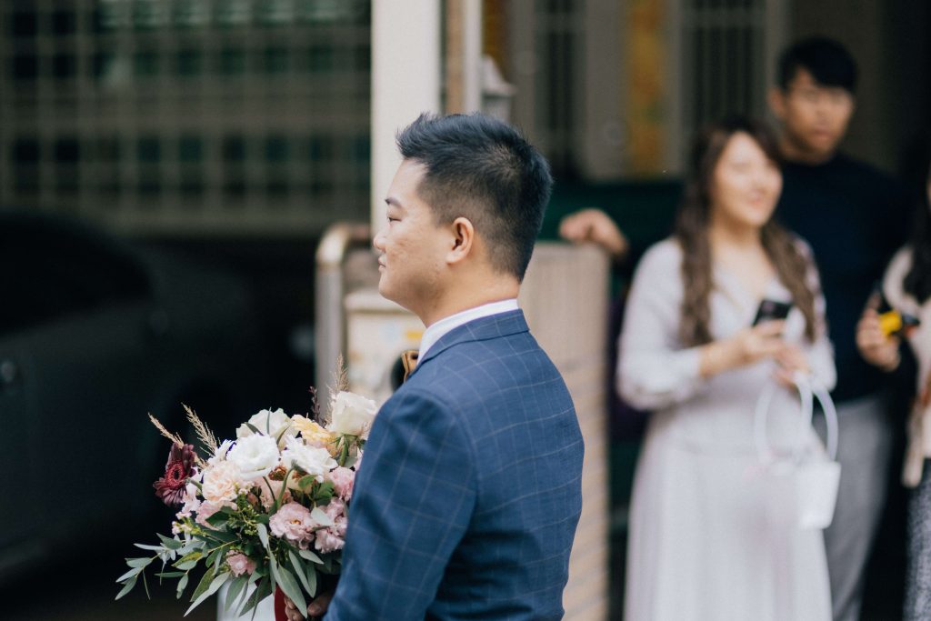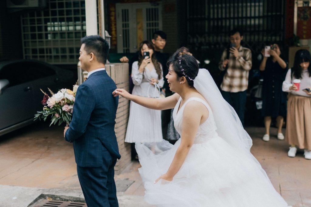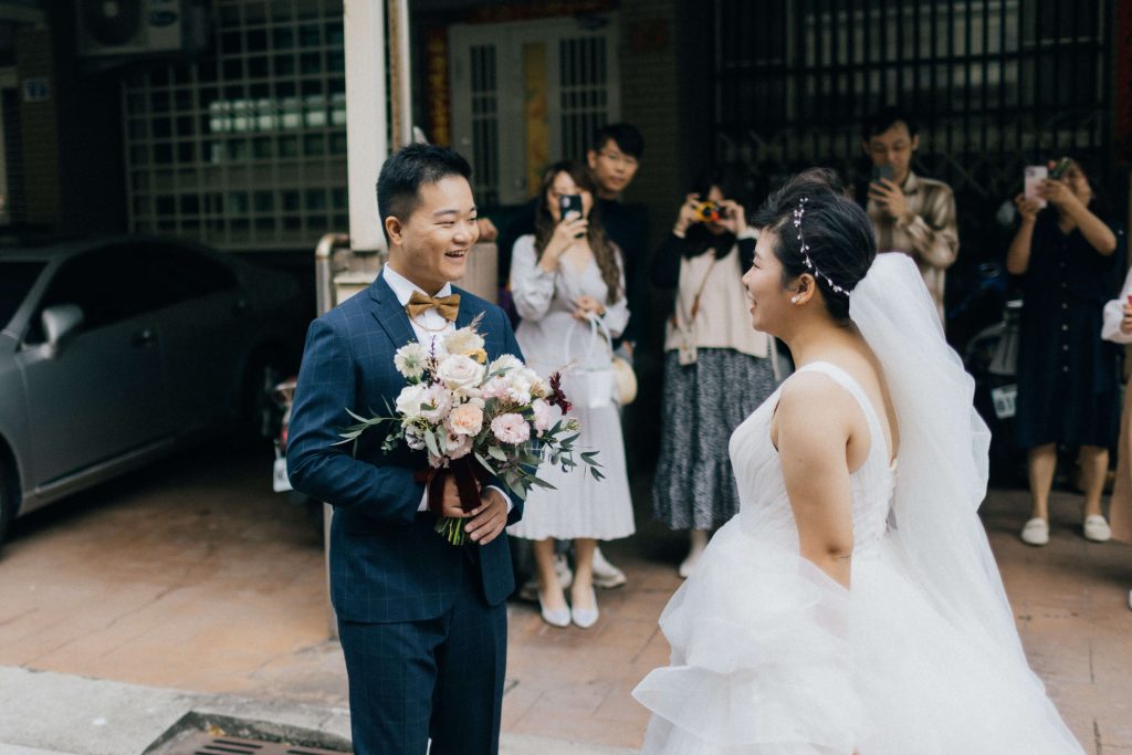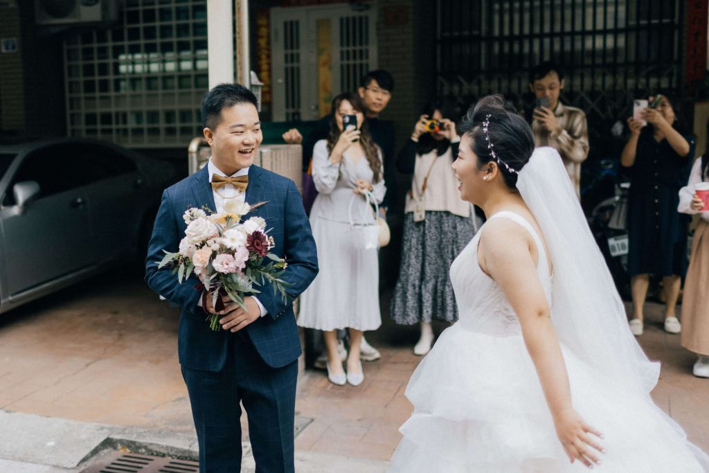 First Look是第一次用視訊訪談時候,婉靖提出想要加進流程裡,希望能夠在熟悉的家,在家人朋友的身邊完成這個儀式。設計First Look的時候,一般我會建議新人要找空間單純、安靜的地方,這樣在表達情緒的時候也比較能自然安放,不會受到別人的目光或是聲音影響,可是所有別人以為相似的流程,都會因為人的不同而產生新的樣貌,所以也許對婉靖和瑞璋而言,熟悉的街景、安心的家園、還有一群可愛好奇的親友才是這個儀式迷人之處,那麼只要排除掉會有大影響的因素,像是廠商們的時間跟方案預算,那剩下的就是讓一切好好的發生。