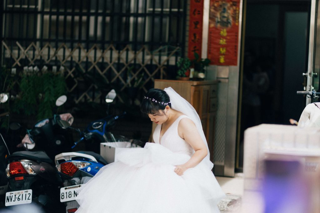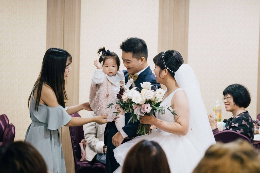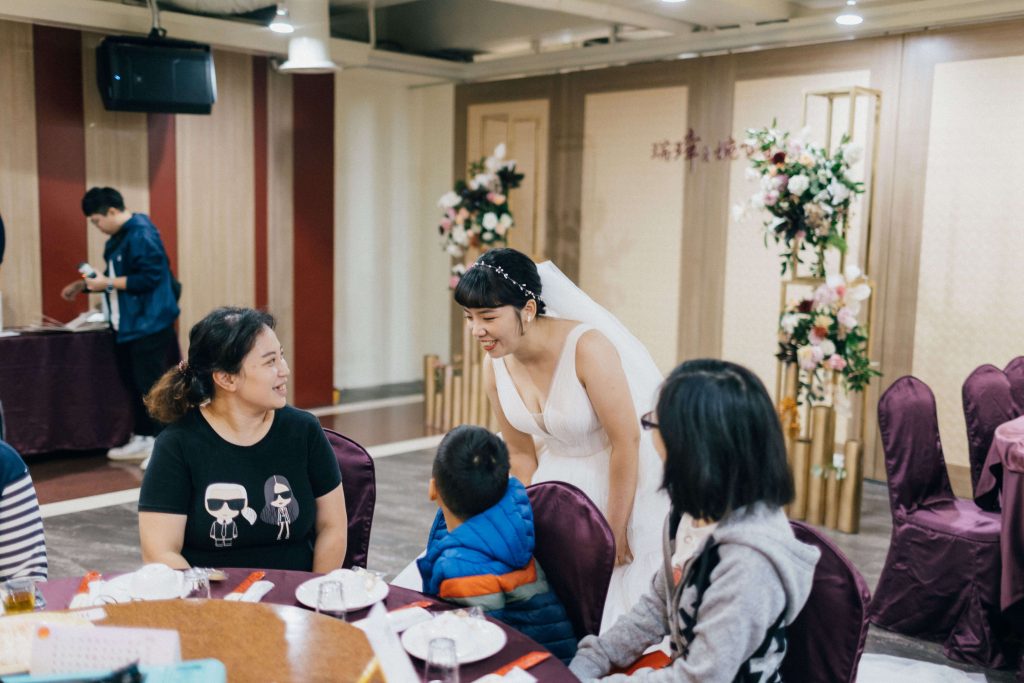 三套禮服加上兩個活動安排,Ting當天除了逐桌敬酒以外相對的自由活動的時間相當少,所以雖然選的是大裙襬的白紗,場地限制多,迎賓區比較小、大廳空調不給力,對新娘來說真的不是行動方便且舒服的環境,但當他提出想迎賓的時候,我也還是安排了(ゝ∀・) 這一年下來也大概能了解他的個性,好在新秘沙美時間抓得剛剛好,婚禮前讓他出來透透氣跟大家聊聊天,爭取更多的時間可以跟大家拍照互動,為白紗做更多的紀錄之餘,也能讓新娘更放鬆一點