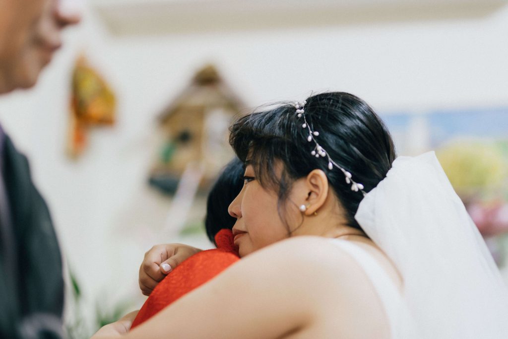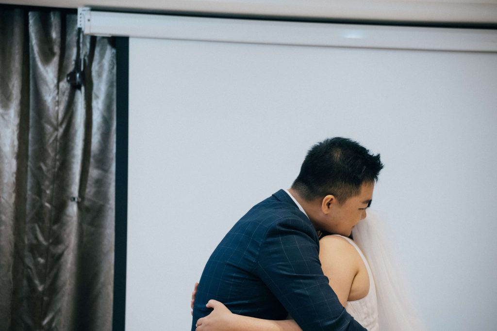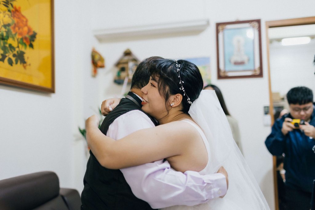 相對於新娘多數的交手環節,我近年也常常在婚禮安排新郎的擁抱環節。亞洲社會裡男生被教導不能哭、不能軟弱,即使社會進步了,有些根深蒂固的形象還需要時間去慢慢改變。彩排的時候,我也沒有省下這個環節(有時候會看每個人情況決定要讓流程提前被家長知道與否),SB的爸媽都是非常海派大方的人,多數這樣的人在人多且情感豐沛的場合裡,容易想逃XD,所以彩排的時候將擁抱彩進去,媽媽一臉:幹嘛要擁抱的臉,我真的笑哭(。◕∀◕。)