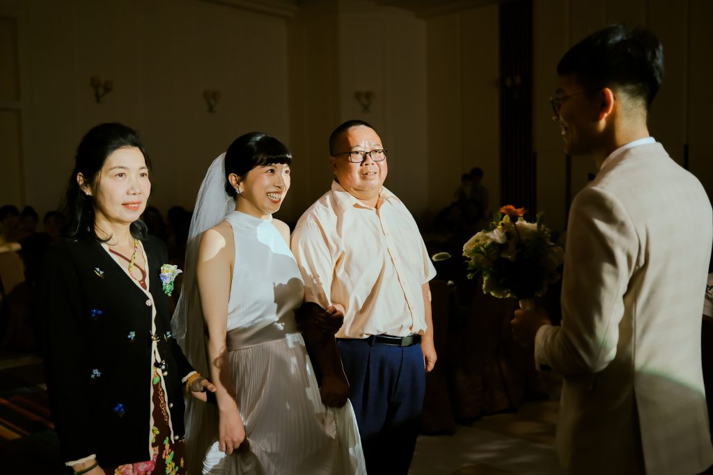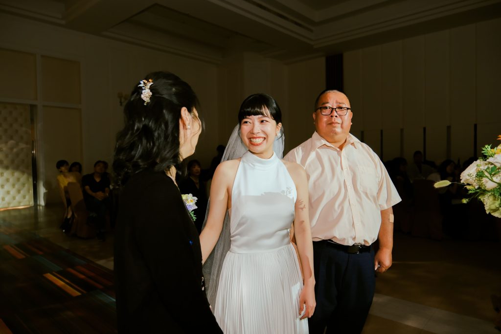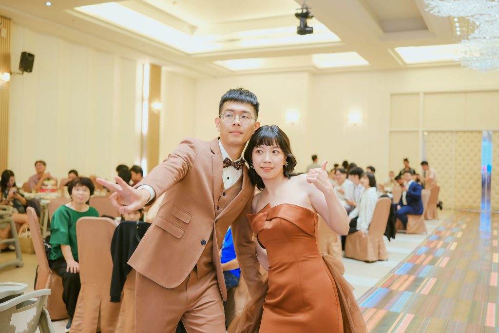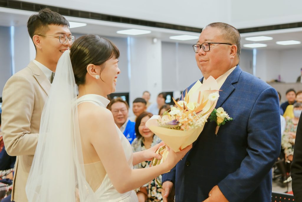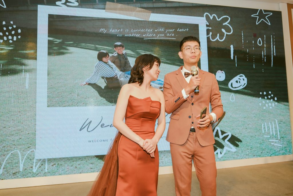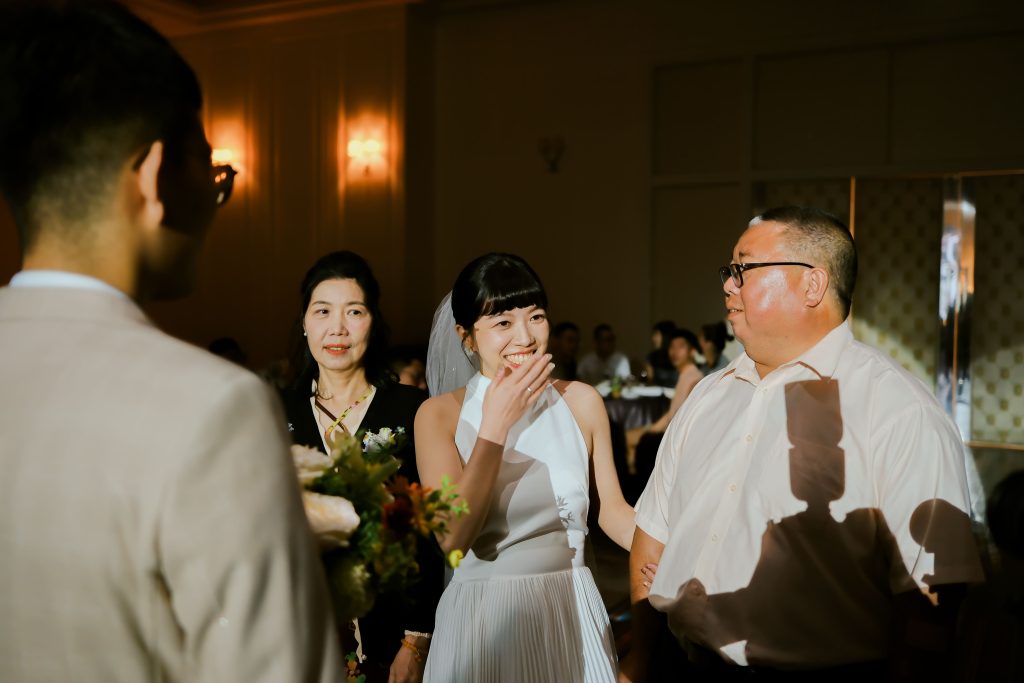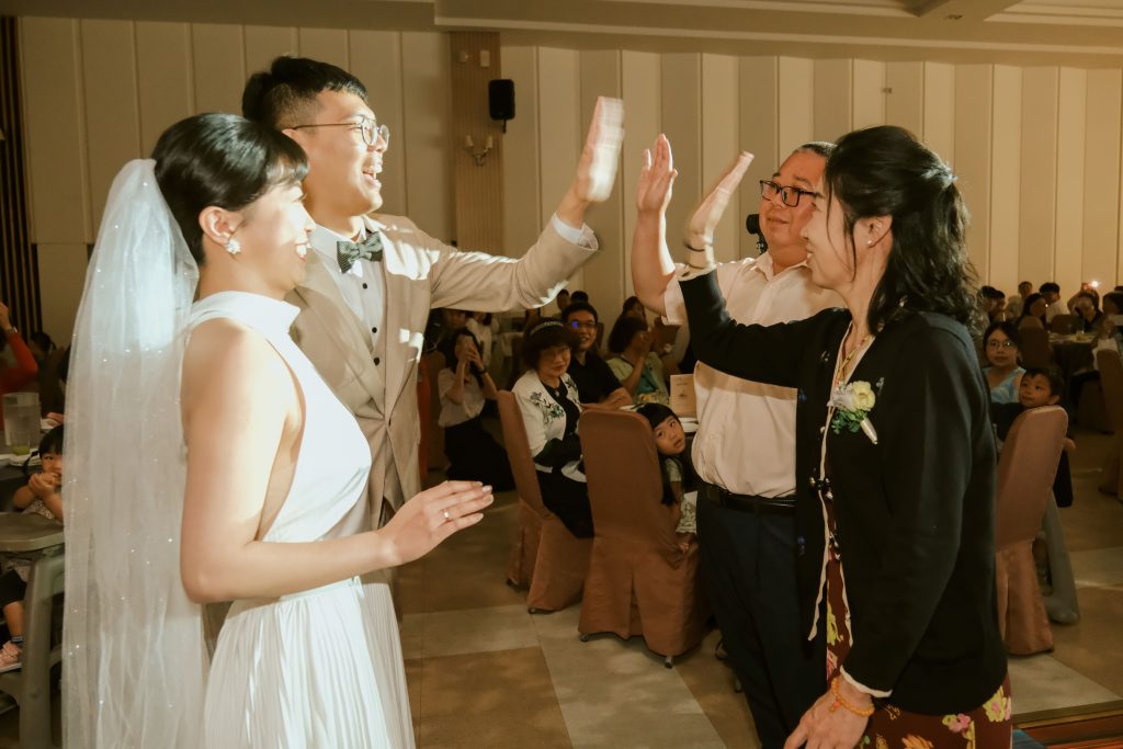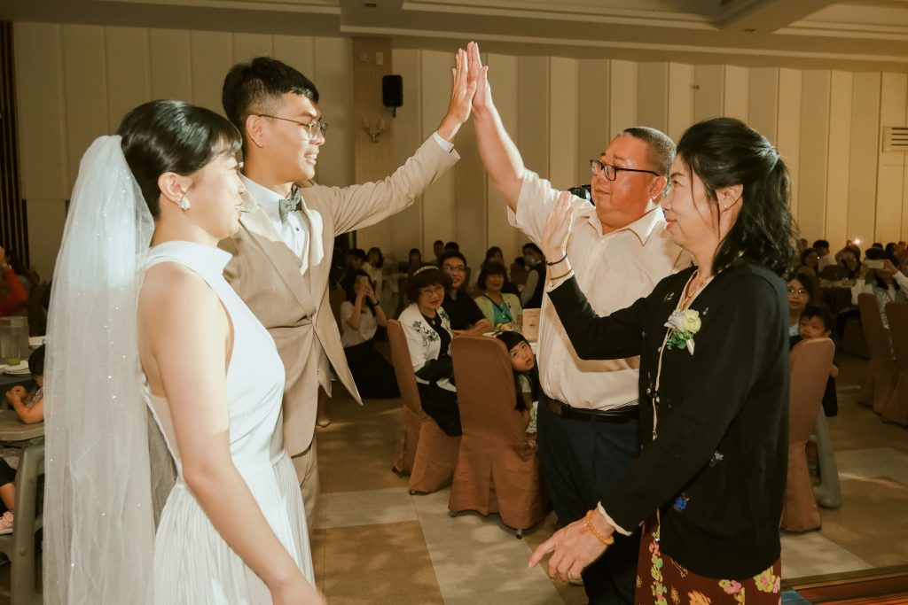 重新在檢視流程跟模擬流程的時候,總覺得用鞠躬來呈現不太適合他們跟家人相處的狀態,所以婚禮前一起到餐廳彩排的時候,跟他們討論用擊掌去取代鞠躬,殊不知當天洽好成了轉換氣氛的一個方式(沒有預料到會哭),讓原本有點感性的氣氛變的歡樂可愛。