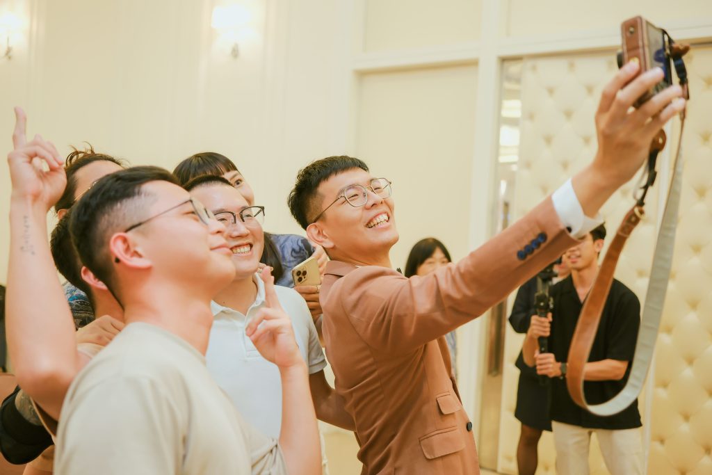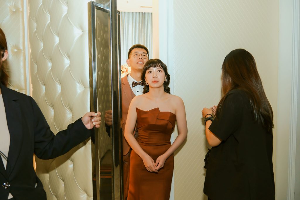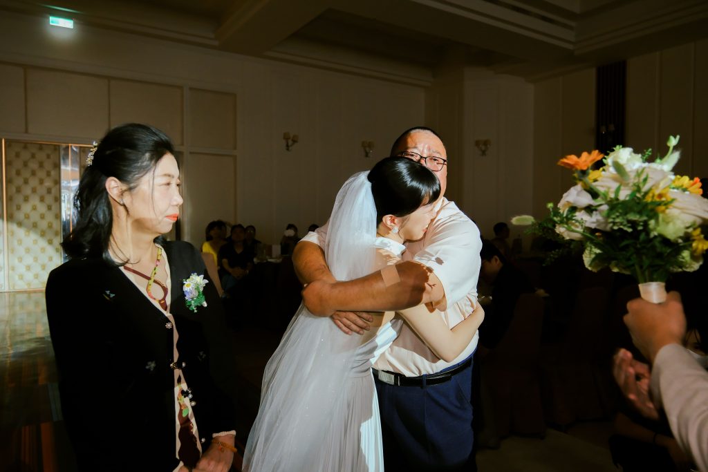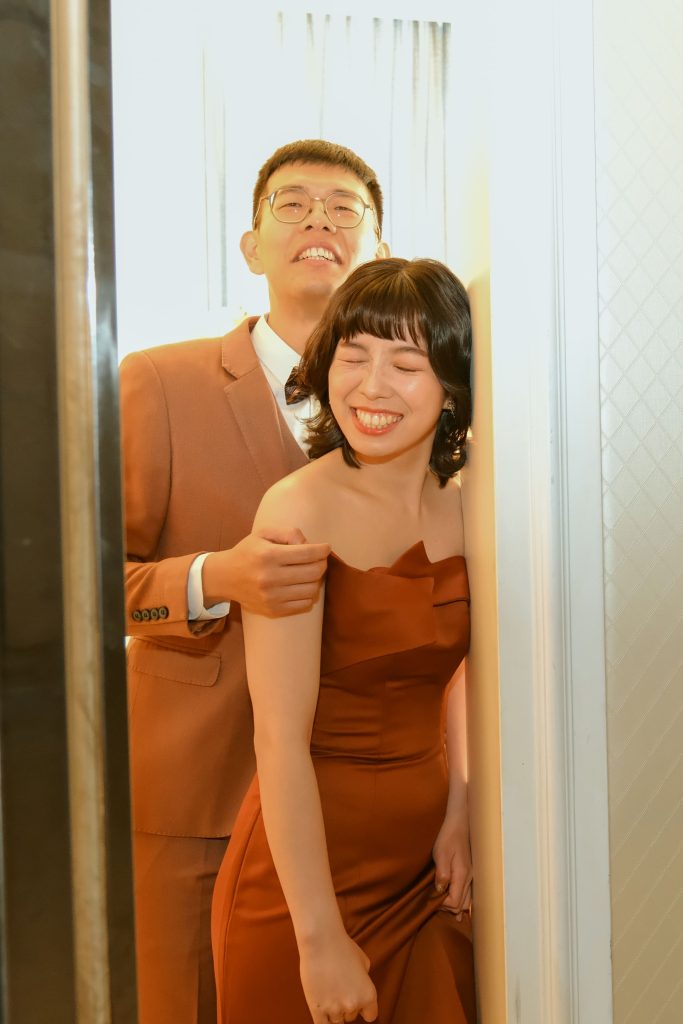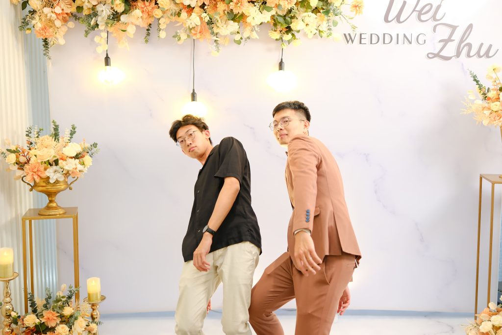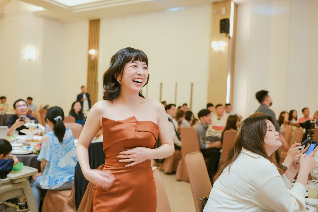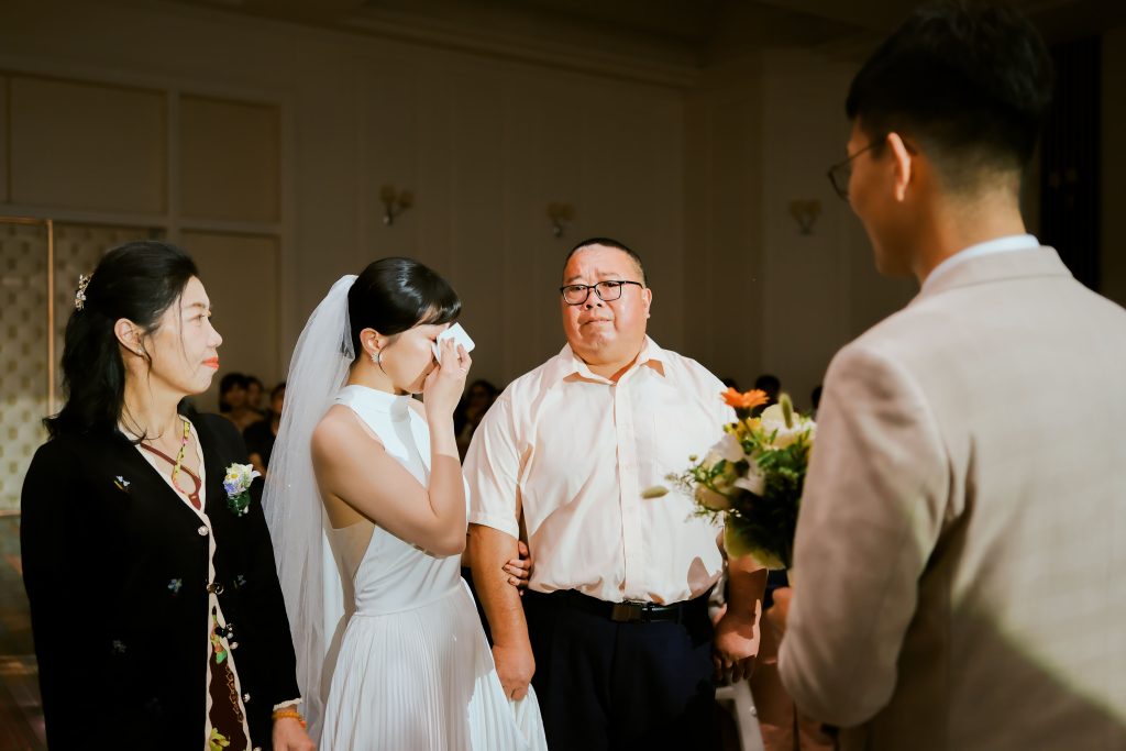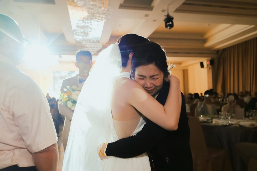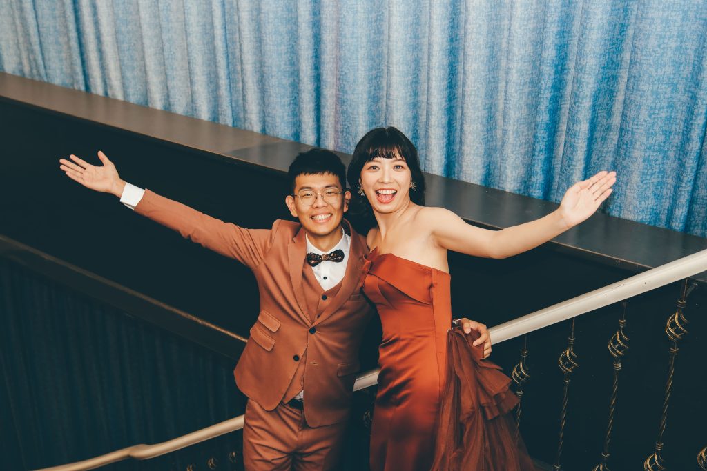 重新在檢視流程跟模擬流程的時候,總覺得用鞠躬來呈現不太適合他們跟家人相處的狀態,所以婚禮前一起到餐廳彩排的時候,跟他們討論用擊掌去取代鞠躬,殊不知當天洽好成了轉換氣氛的一個方式(沒有預料到會哭),讓原本有點感性的氣氛變的歡樂可愛。