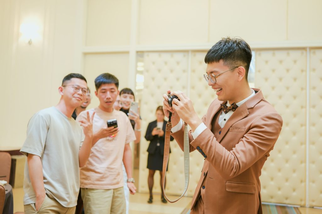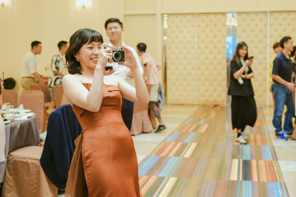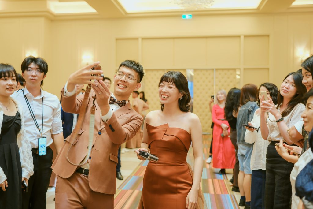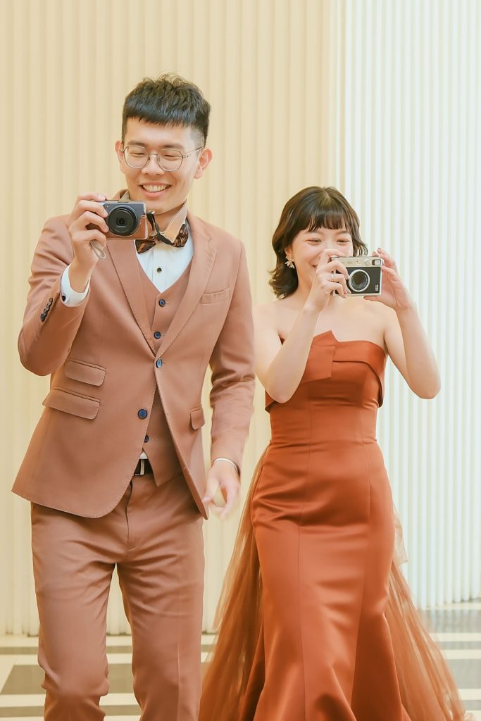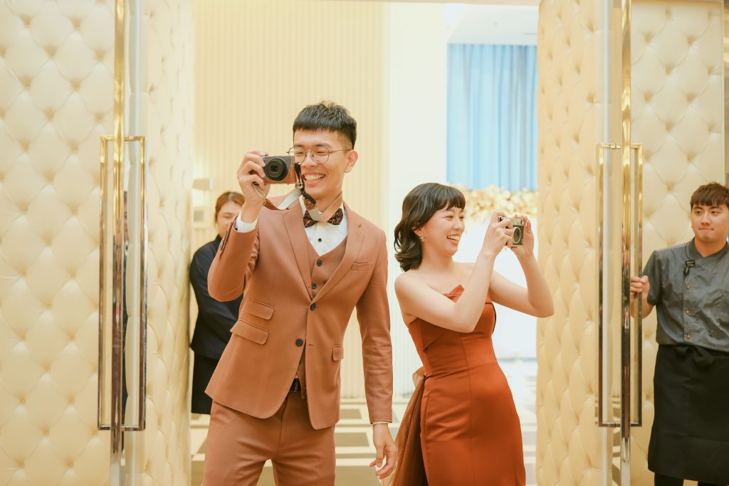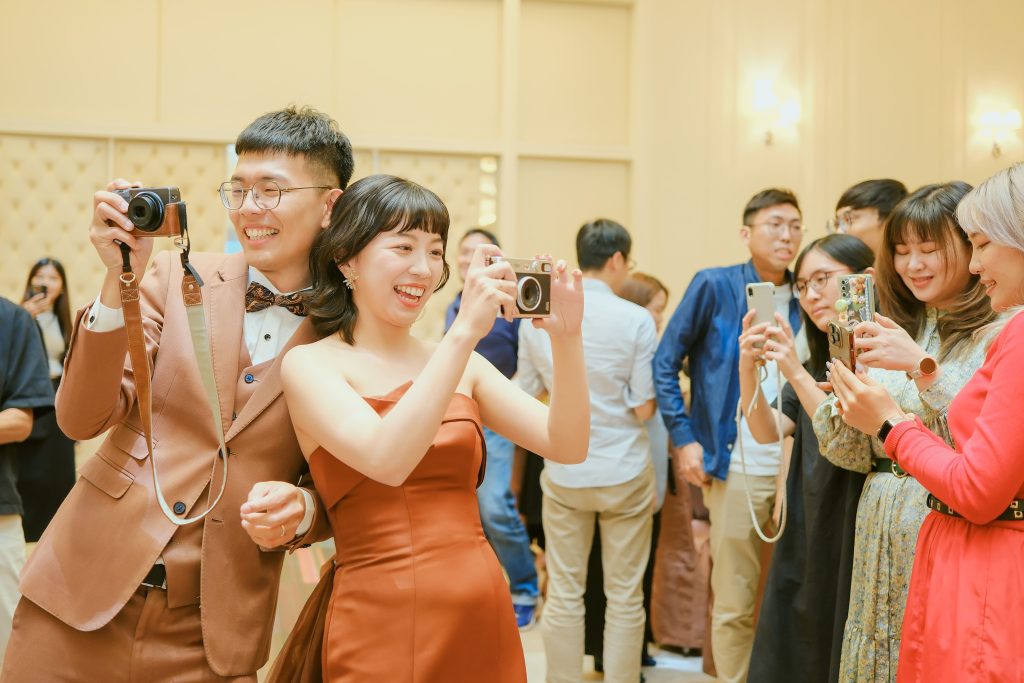 第二次進場就是用兩個人旅行中最常做的事:拍照,作為進場的方式啦!最近比較常見用底片相機進場,記錄下每一個親友在看見你們的那一刻,但因為他們比較常用相機,所以宗暐拿的是他平常用的GR3、婉筑則是拍立得相機,後來發現這種進場方式要找對焦快一點的相機,因為對於認真攝影的人會忍不住想要停下來對焦٩(๑•̀ω•́๑)۶,雖然拍出來的成果偏鬧,不過這樣的互動感覺對他們來說放鬆很多(?)焦點回到賓客的身上,也不忘記錄著他們彼此,超級可愛🥰