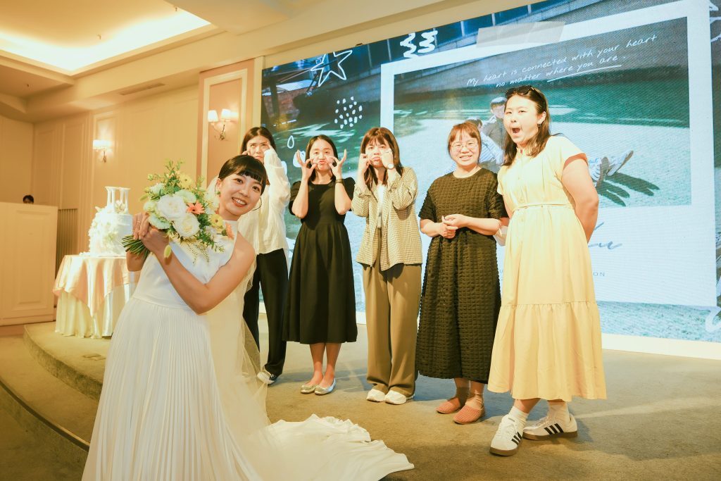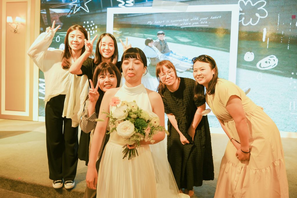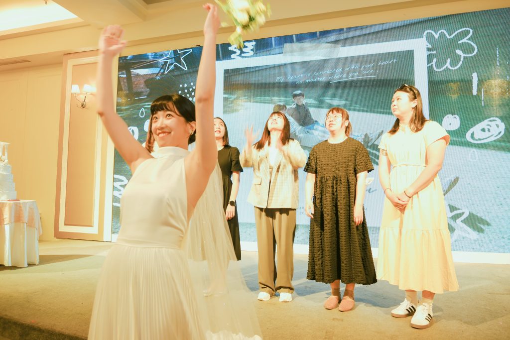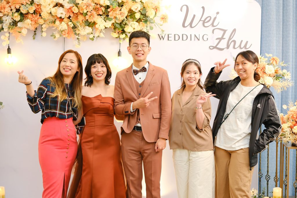 (穿白紗送捧花也是我很喜歡的流程設計,覺得穿著白紗將捧花送出去更有祝福的涵義!謝謝這些姐妹陪伴他一路到結婚!)