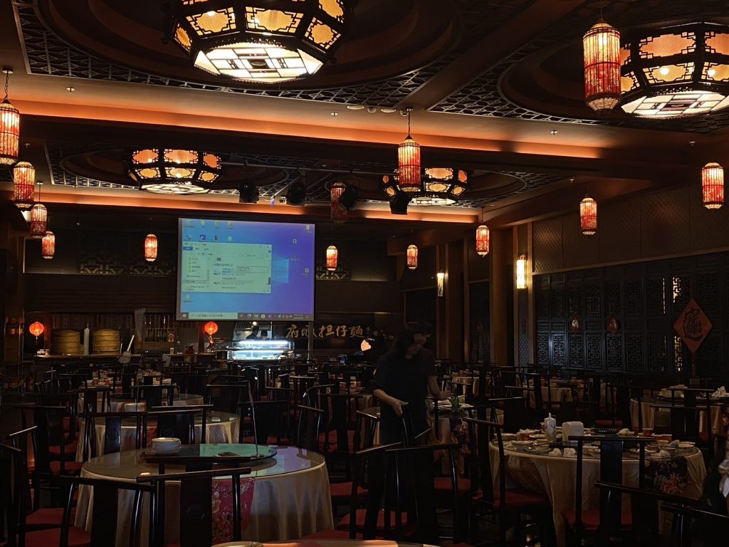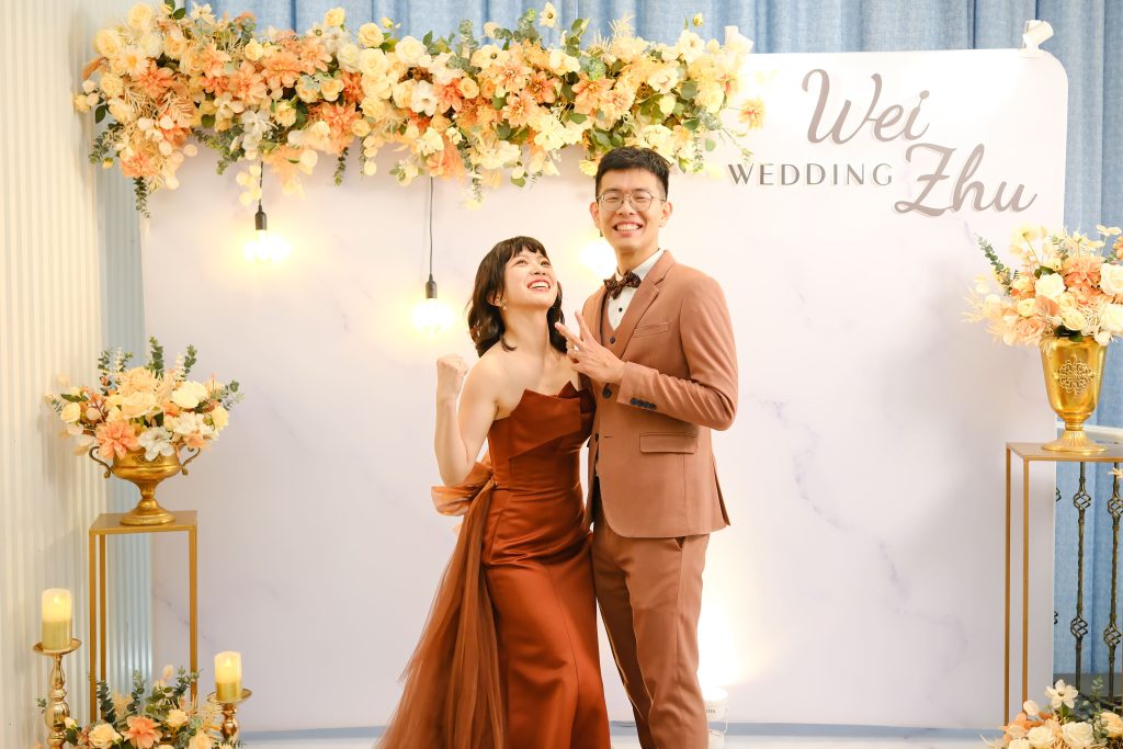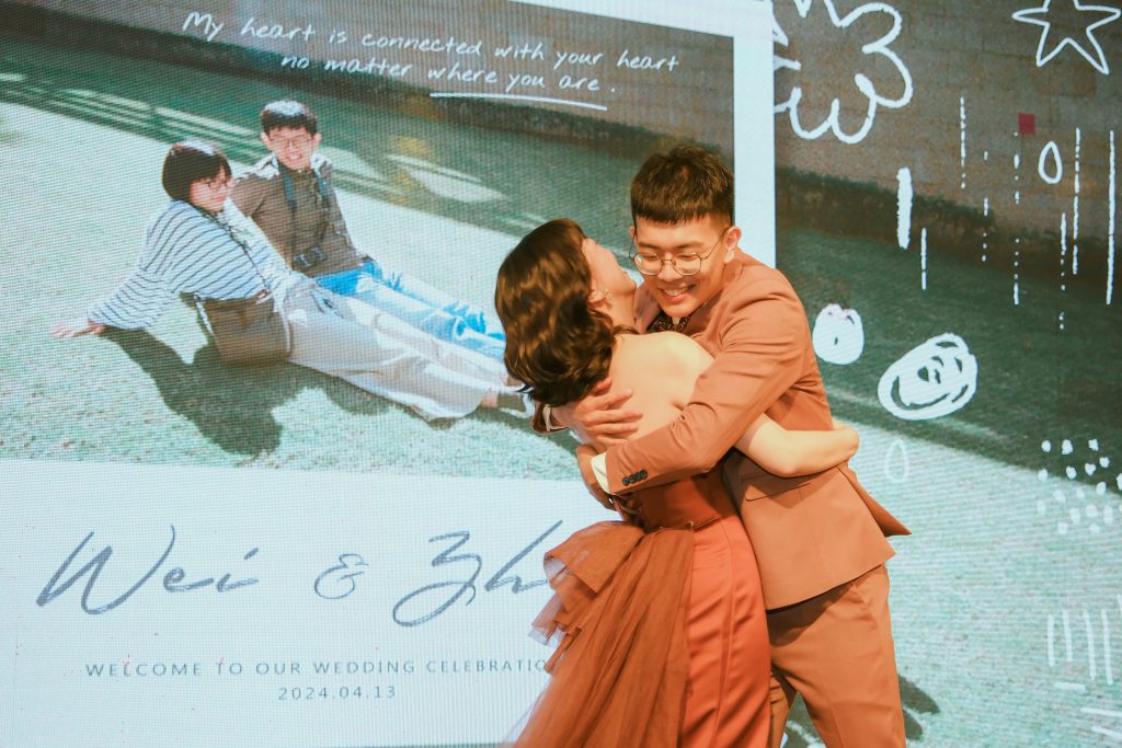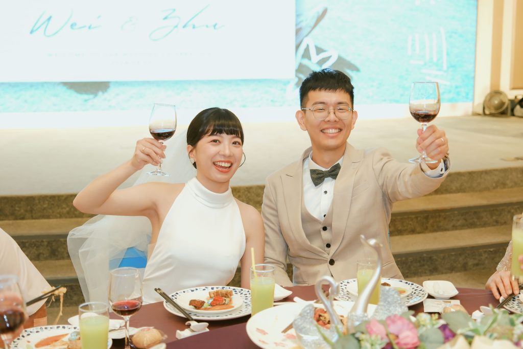 原先宗暐跟婉筑的場地是在台南府城食府,場地風格是強烈的台式設計,府城食府是台南老字號東東宴會廳底下的其中一間宴會廳,曾入圍米其林三星,當初的想法是希望大家可以來到這個他們戀愛時期常約會的城市享用道地的台南美食。宴會場地只有一個廳房,容納的桌數理想在23-25以內,因為婉筑跟宗暐的桌數接近30桌需要打通旁側的包廂區,場地的投影幕只有一個,設備較老舊,播放影片效果不佳,包廂區的賓客視角不容易看到畫面,設備對接後螢幕的成色不如預期,所以非常緊急的在婚禮前不到一個月的時間換到了隔壁同集團的東東華平館。