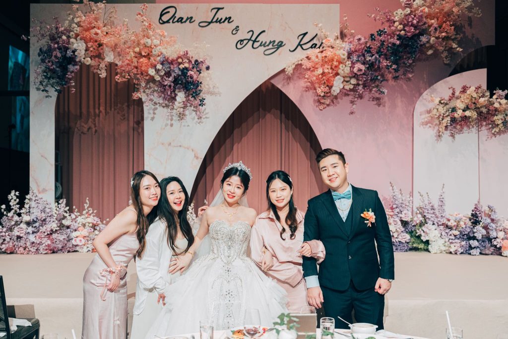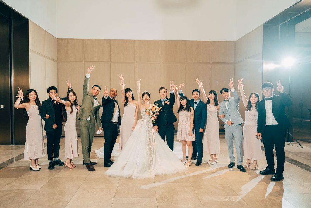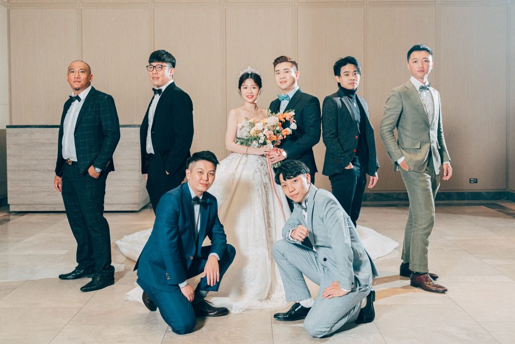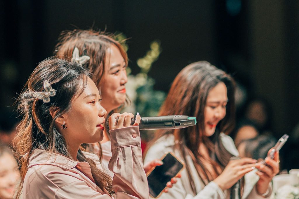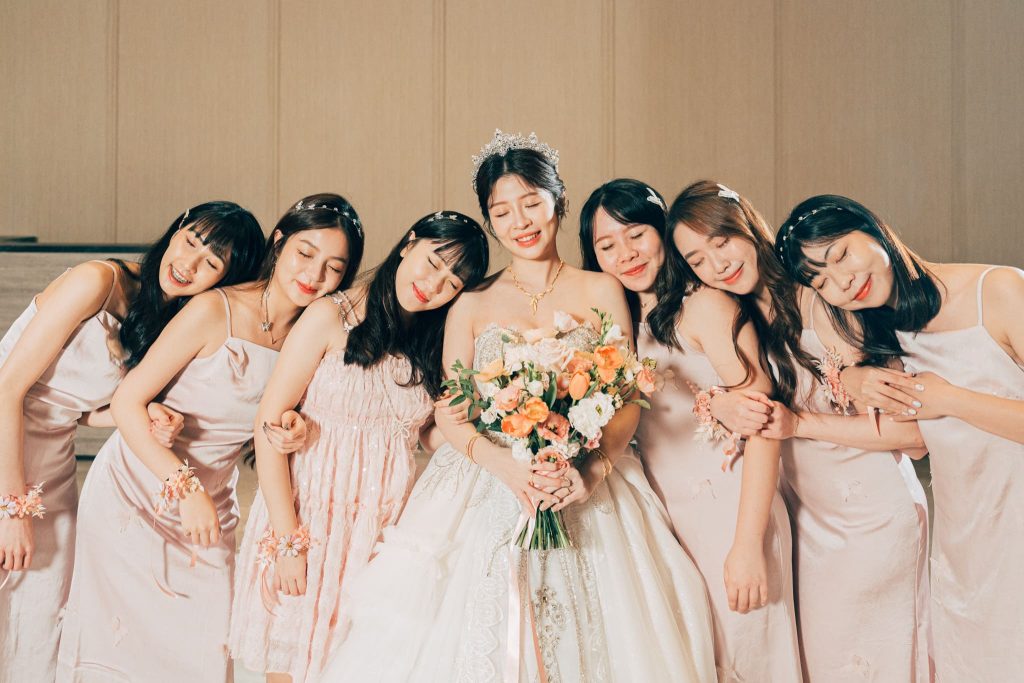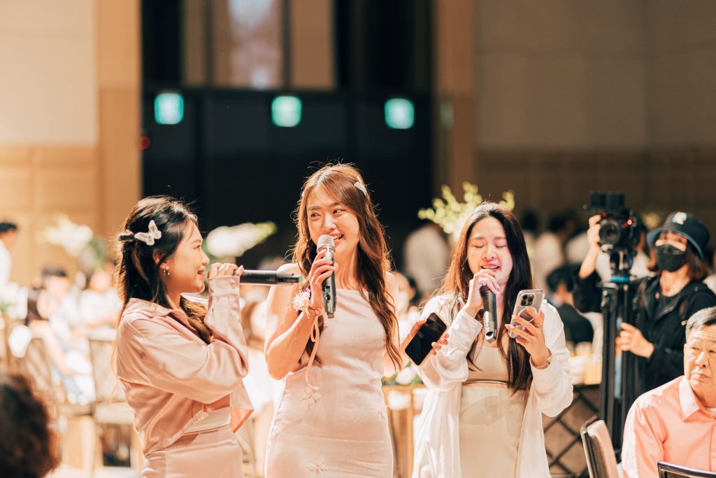 最後一個驚喜,則是送給新娘千千的。她的三位好朋友透過新郎愷聯繫我,希望能用歌聲,親自獻上對好姊妹的祝福。我們將這段驚喜安排在「祝福捧花」之前,這樣不僅能保留千千穿著白紗與姊妹合照的畫面,也能在整體歡樂氛圍中,加入一段溫馨且深刻的情感。
