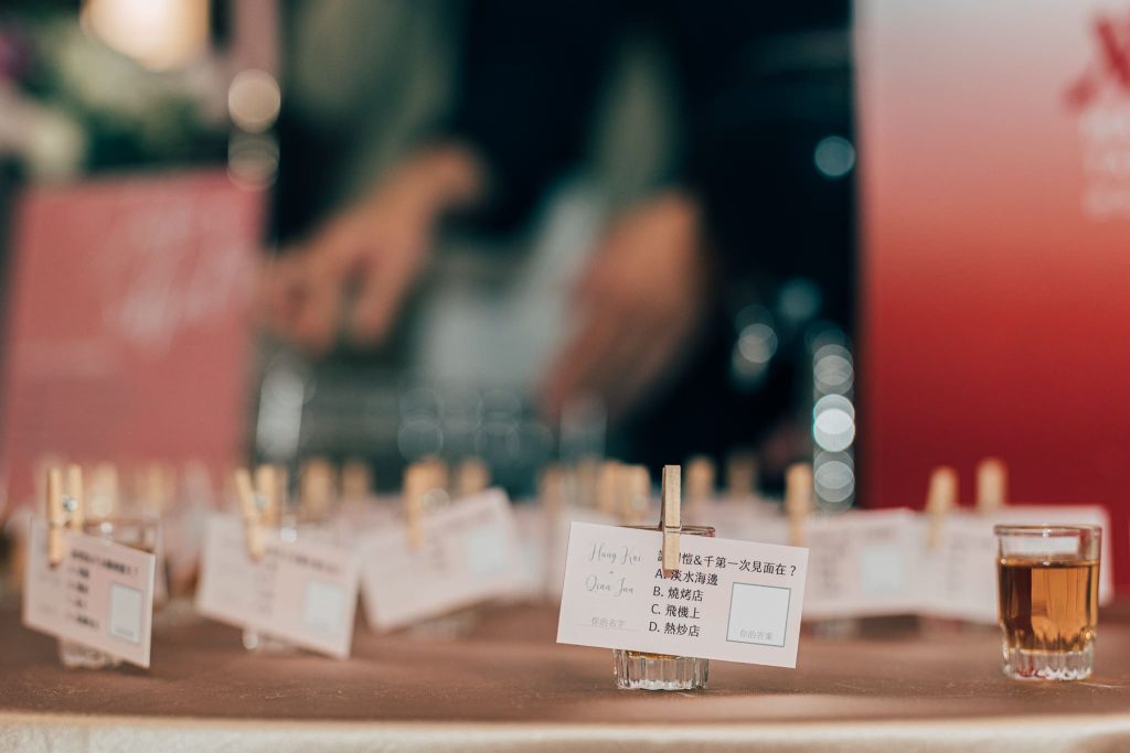 因為千千懷孕,不能盡興暢飲,所以只能「請賓客喝」,同時為了結合他們品牌的主要商品 Carebear,我設計了有趣的問答小卡,讓賓客在喝酒的同時回答問題,再抽出幸運得主。這樣的設計,既延續了他們想要「歡樂」的氛圍,也能在抽籤的過程裡讓大家更了解千千跟愷的故事。