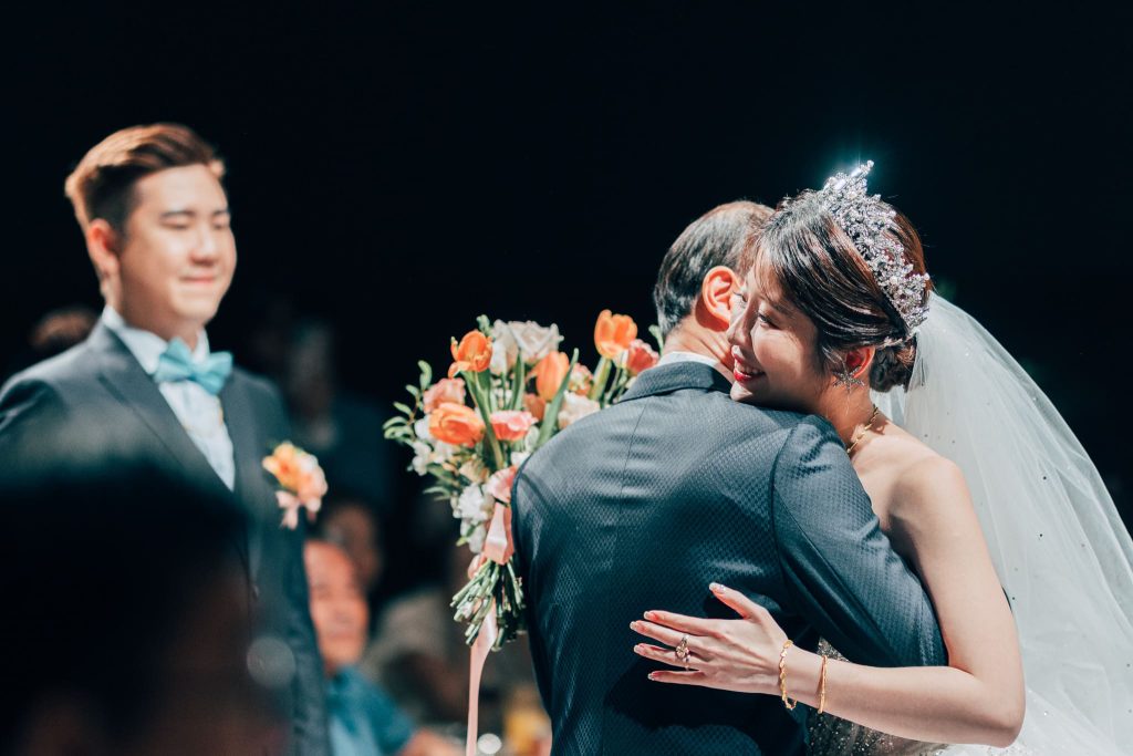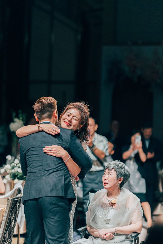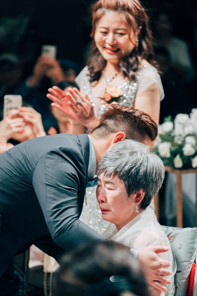 第一次進場時,安排千千和愷的媽媽一起走紅毯。因為兩個人婚後兩邊的家人同住,彼此關係緊密,甚至一起幫忙照顧小孩,當愷擁抱兩位媽媽時,眼淚差點奪眶而出。那一刻,連我在舞台上也忍不住紅了眼眶。