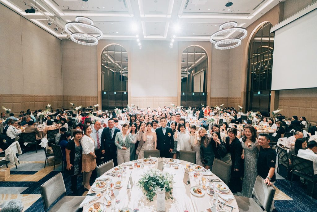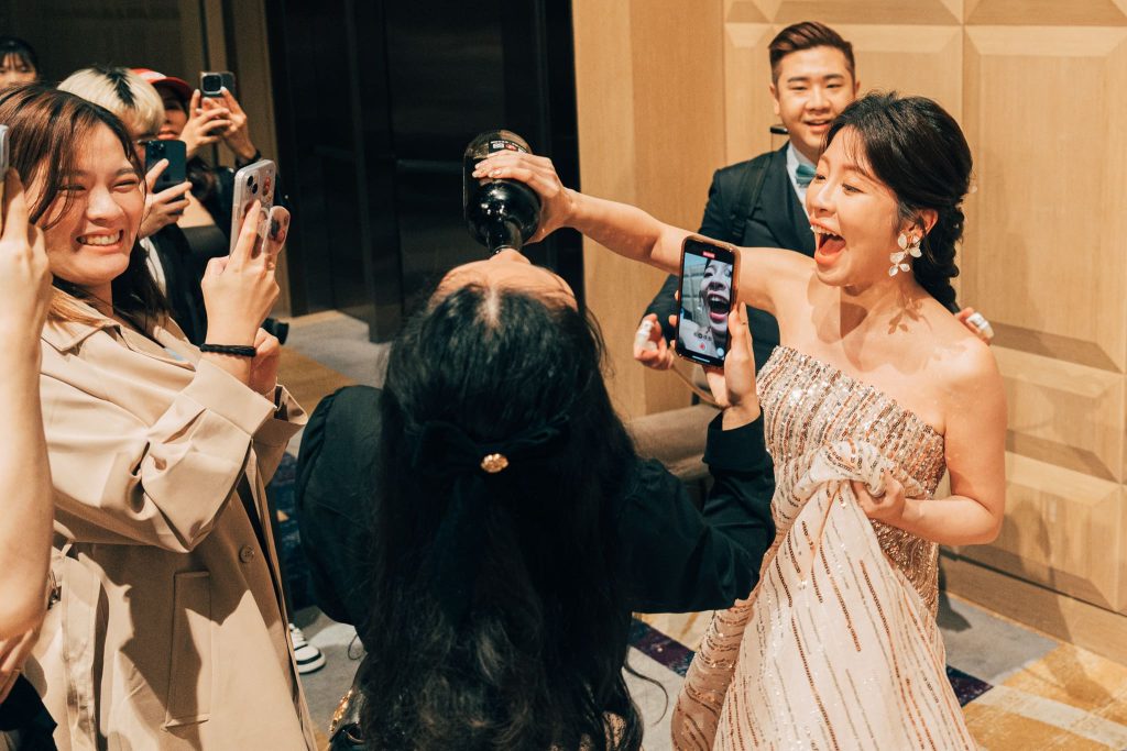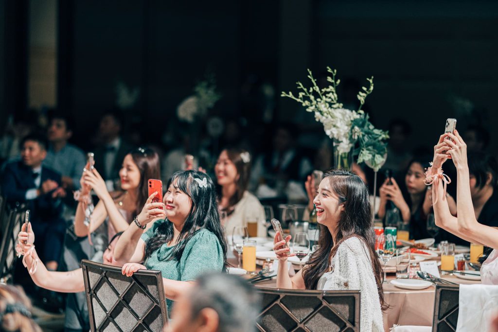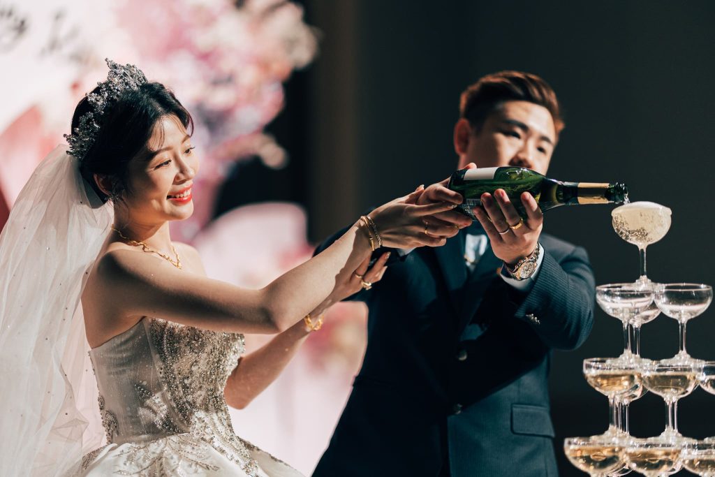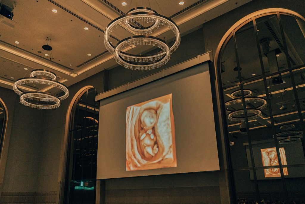 於是,我們把「公布二寶」跟「性別預測」安排在第二次進場灌酒後的大合照環節。當愷和千千進場,與賓客們合照後,現場燈光突然暗下,播放點點的超音波畫面。那一瞬間全場賓客都屏息,隨後爆發出驚喜與祝福,這樣的安排,是希望能捕捉到每位賓客──那些在他們人生中重要的家人、朋友──得知消息時最真實的表情。千千後來告訴我,她站在大家身邊,清楚感受到身邊賓客的反應,自己也差點忍不住落淚,那是屬於他們一家人的高光時刻,一份用愛串連的驚喜。