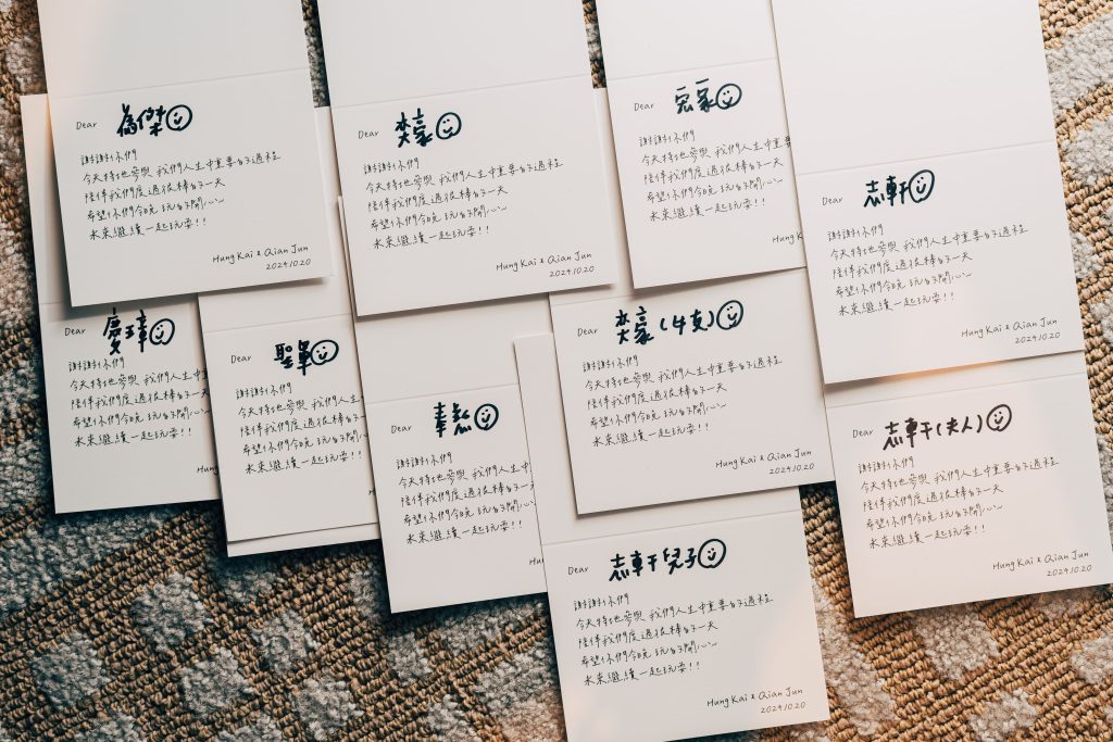 沒有準備婚禮小物,取而代之的是每位賓客桌上的小卡。小卡由我協助設計並撰寫內文,而名字則由千千親手寫上。250位賓客,對於本就忙碌的他們而言,這絕對是份誠意十足的心意,雖然不是貴重的禮物,卻是帶著最真摯的感謝。
