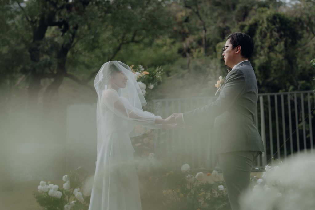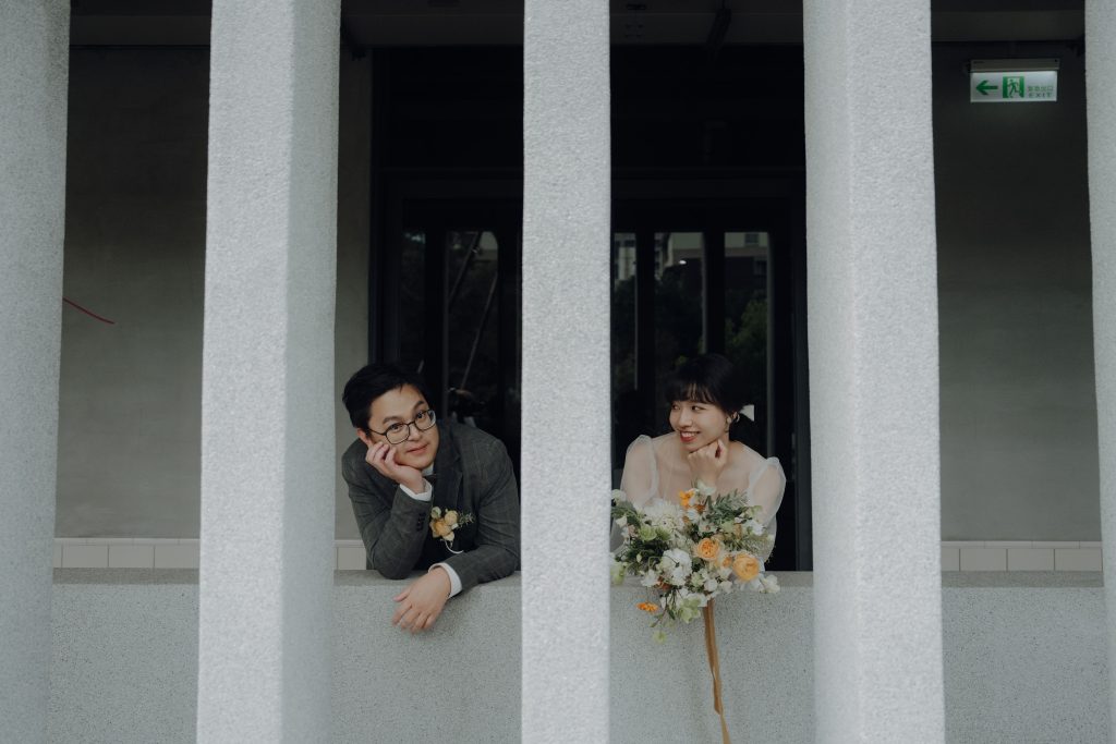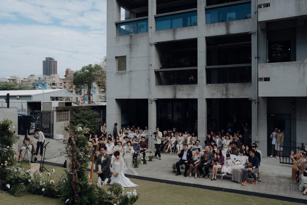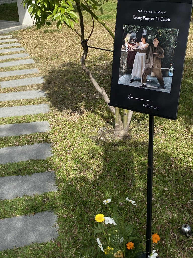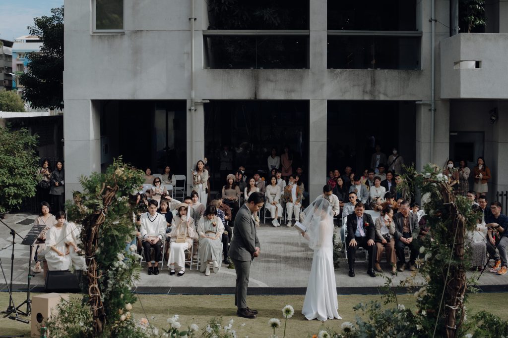 金馬賓館建築以灰黑白作為主色調,給人感覺沉穩內斂,空間上有很多的露臺、格柵牆面的設計,讓陽光可以從不同角度透進來,光線穿過建築有種酷酷的氛圍,婚禮在後院的小草坪上,整體佈置從入口處的草皮的指引立牌到路線上的每一個小型花飾跟廣茜可愛逗趣的婚紗照,多了點俏皮溫暖的味道。