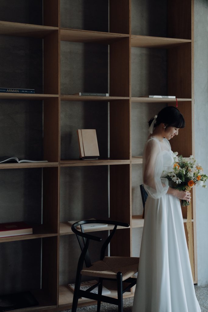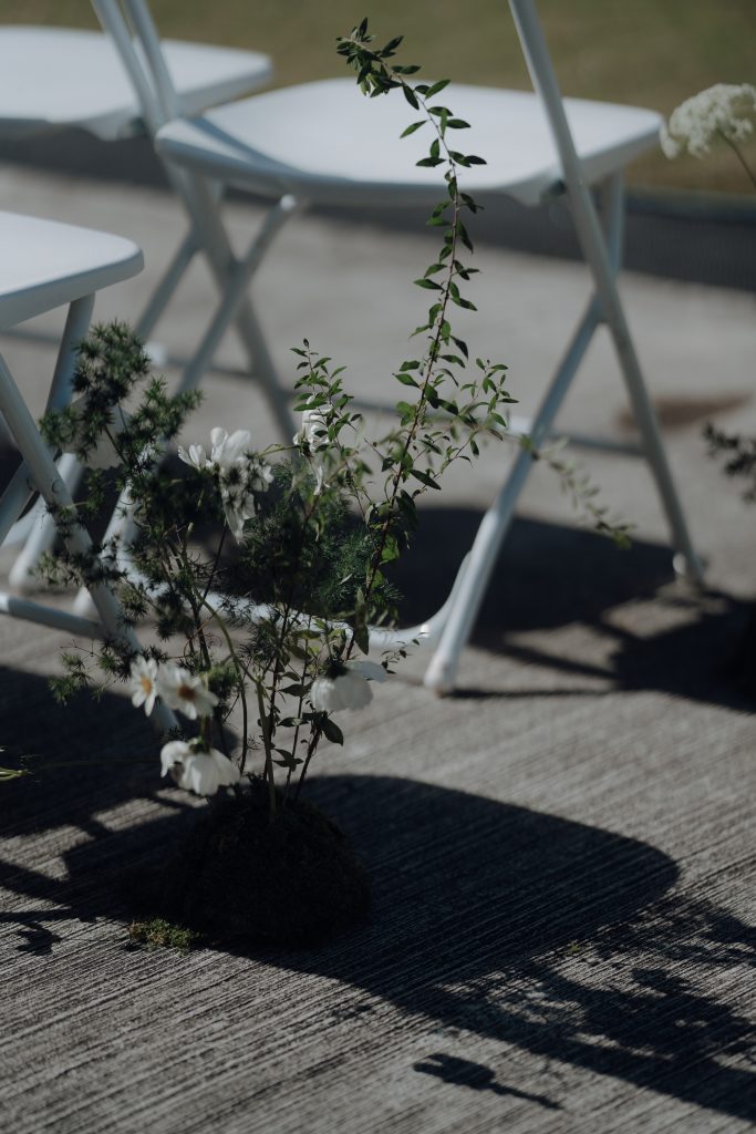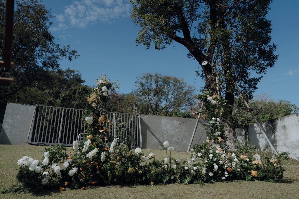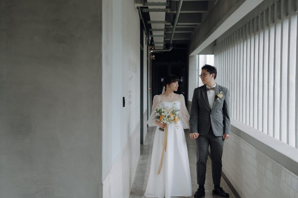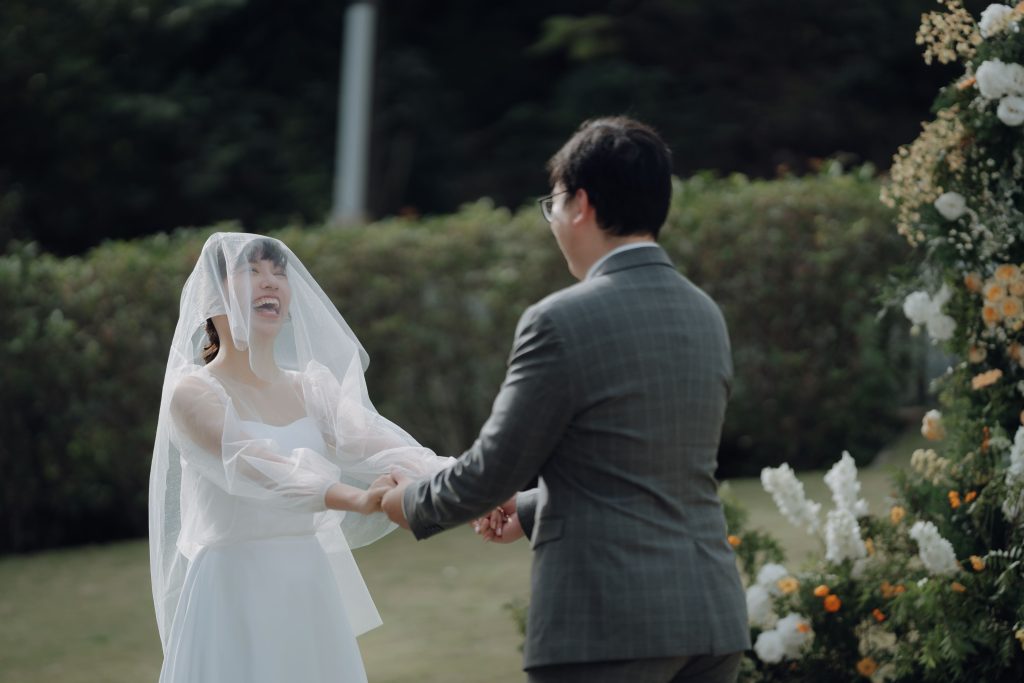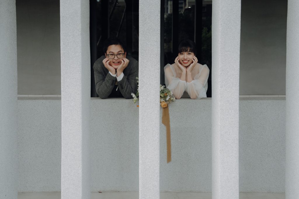 金馬賓館建築以灰黑白作為主色調,給人感覺沉穩內斂,空間上有很多的露臺、格柵牆面的設計,讓陽光可以從不同角度透進來,光線穿過建築有種酷酷的氛圍,婚禮在後院的小草坪上,整體佈置從入口處的草皮的指引立牌到路線上的每一個小型花飾跟廣茜可愛逗趣的婚紗照,多了點俏皮溫暖的味道。