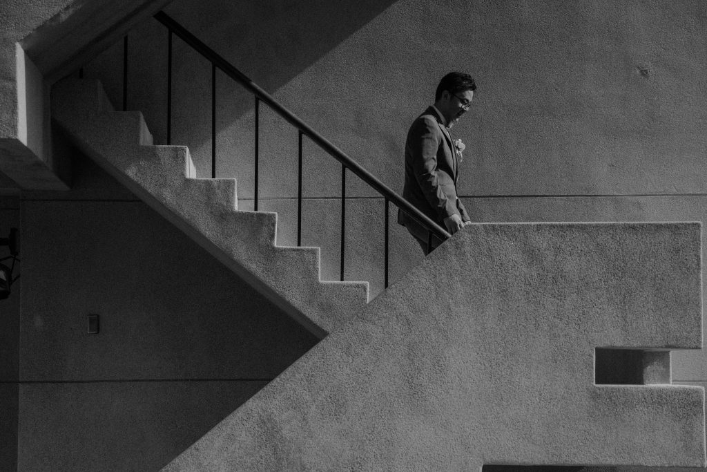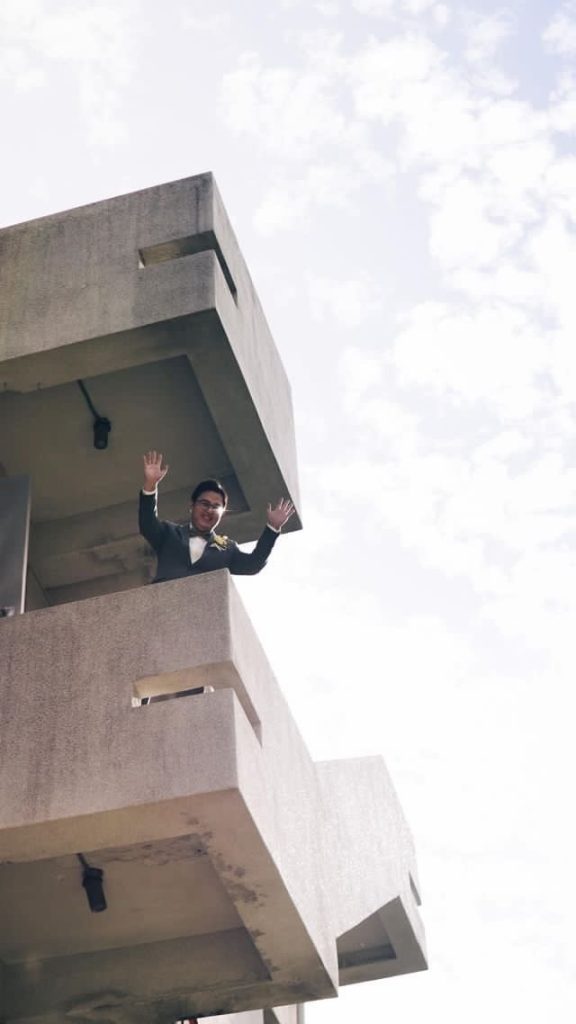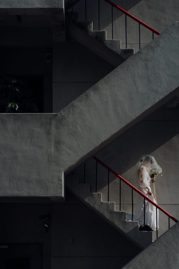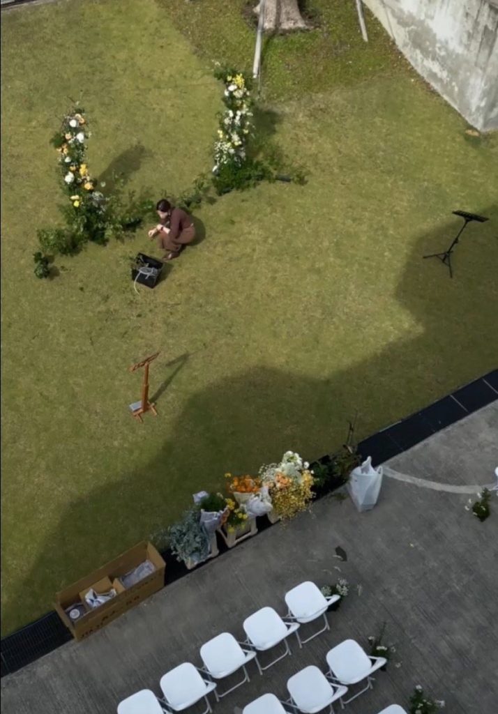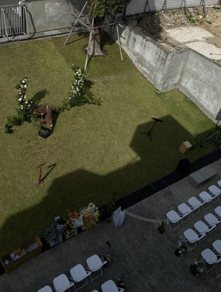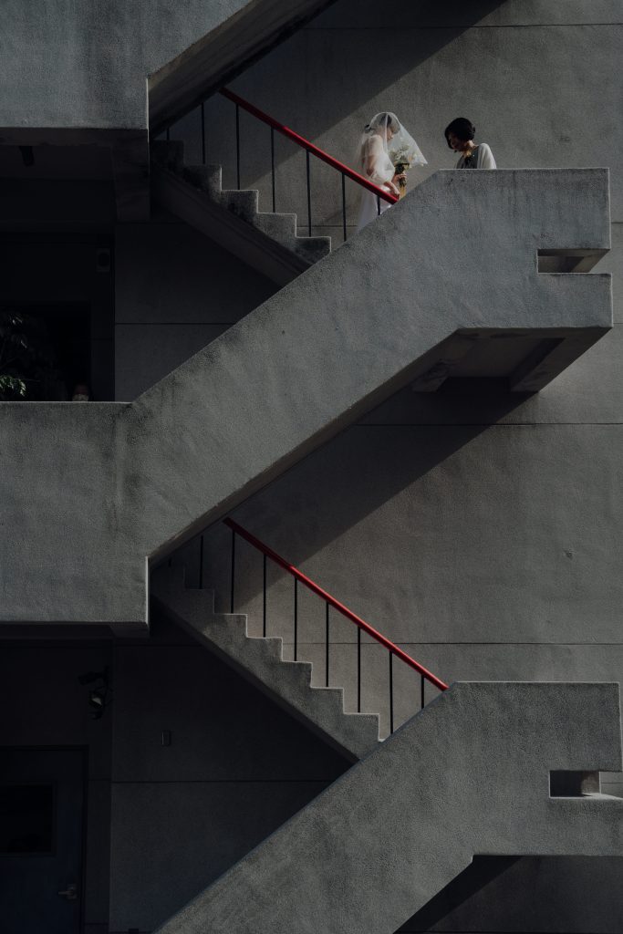 金馬後院的草皮旁連接美術館的台階,有著傳統房屋常見的窄高樓梯、矮矮的圍牆、紅紅的鐵欄杆,站在下方看人群移動的時候會有一種療癒安心的感覺。婚禮前我一個人站在三樓露臺看著Renee、雅如、恩臨,還有許多親友在草皮上忙碌的移動著,突然一刻忘記哪一個工作人員跟我四目交接,當下覺得「也太可愛了吧」(✪ω✪)