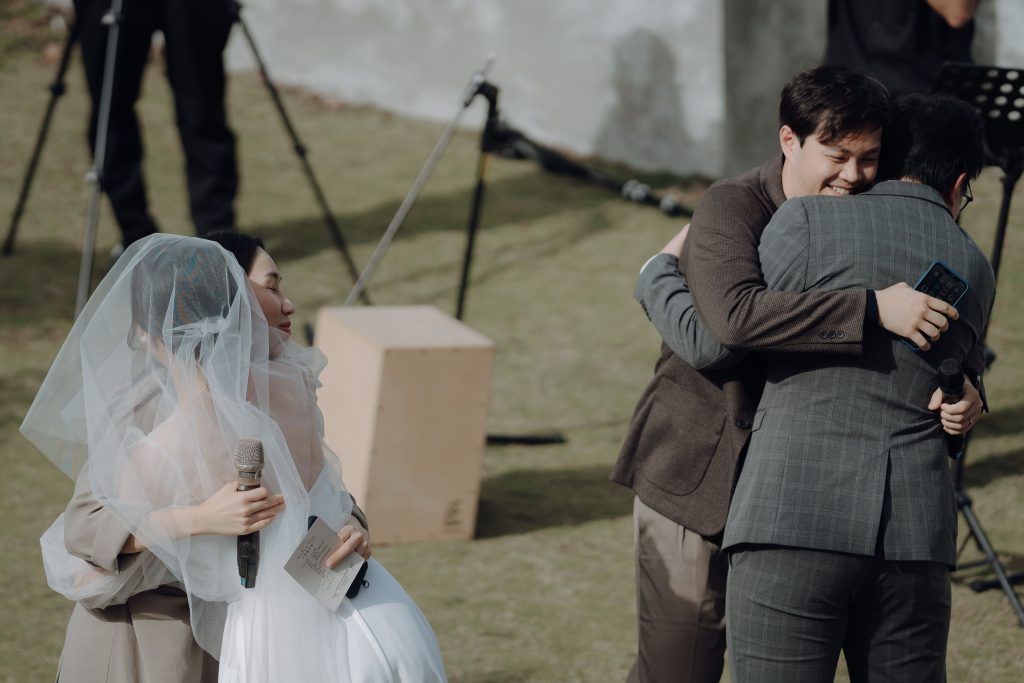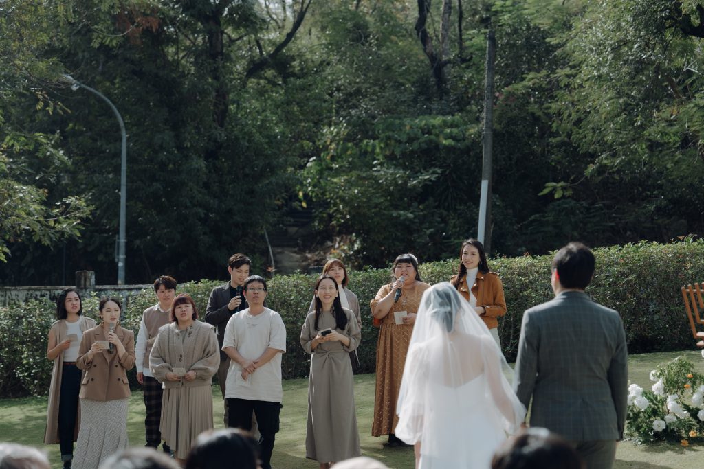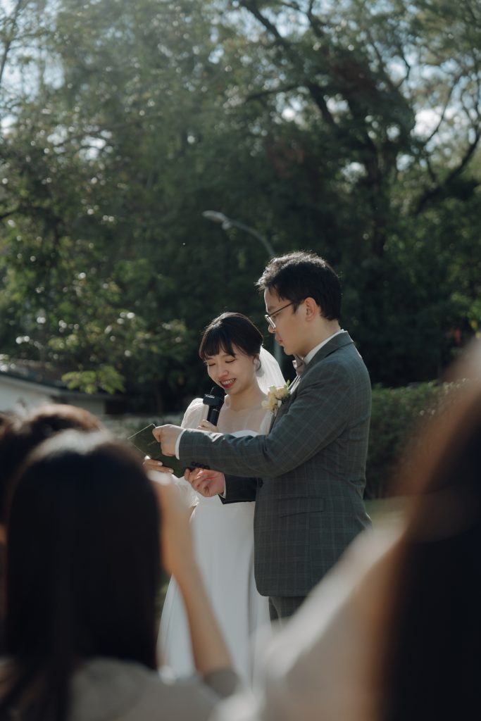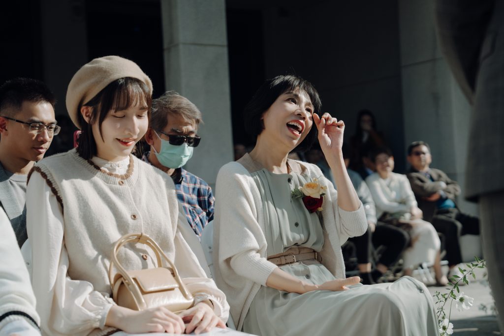 相較於婚禮中情緒起伏的跌宕,證婚帶給我的感受很純粹,單純且直面的感受到每一句話在儀式裡的重量、每個呼吸的深淺、每個人跟新人之間緊密且舒適的關係,每一次大笑跟落淚都能自在且清晰的傳遞給彼此。