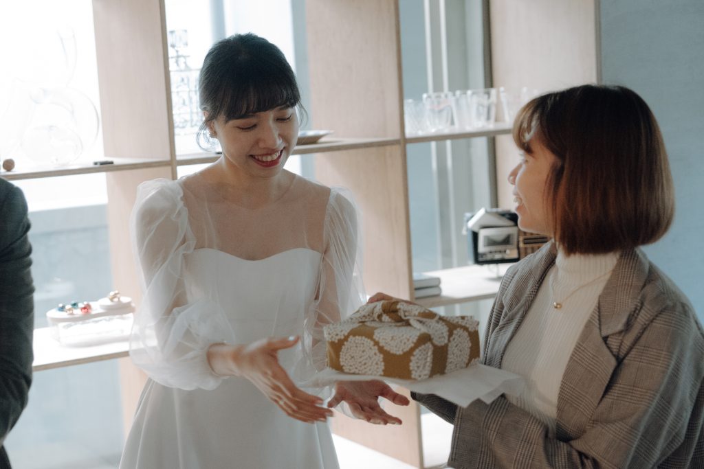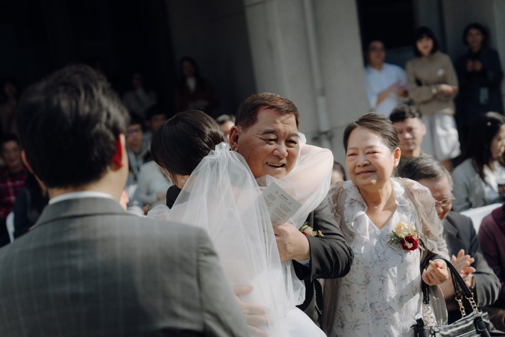 婚禮的尾聲,原先是打算站定點送客順便發喜餅,結果大家已經進入下午茶模式,索性就改成兩個人一起到各桌將喜餅跟小禮物一起發送給現場的每個家人朋友,一邊發也能跟大家閒聊、拍照、擁抱,改成這樣自由離場的模式,也讓彼此自在一些。
