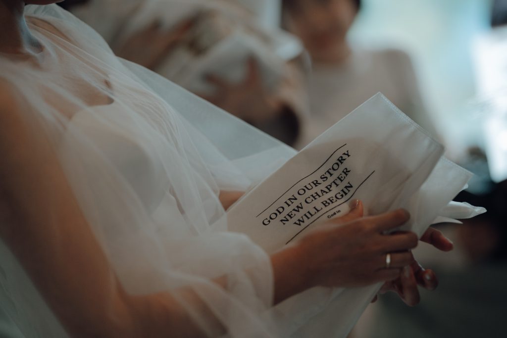 兩個人都是基督徒,希望在教會的儀式能有一個專業婚禮主持人作為整個證婚的引線,而這也是我第一次用教會的方式去引導證婚,一般來說有宗教信仰的新人,會選擇在熟悉的教會進行儀式,教會的弟兄姊妹會各自協助婚禮的不同時段。我本身沒有信仰,對於很多教義不甚理解,所以執行的時候也需要花點時間去理解每一個環節的意義和執行的方式。