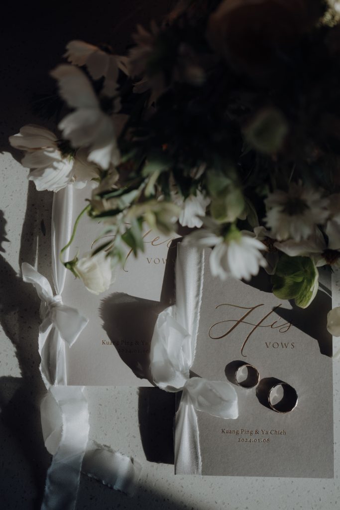 比起「誓言」這兩字給人感覺隆重且謹慎,我更傾向告訴大家這只是在開始婚姻前,好好告訴對方你的感謝,感謝過去這一段時間的照顧陪伴、感謝彼此在經歷過沿路的細碎繁複、平淡無奇,仍舊願意牽著對方的手,支持著彼此,也給此刻跟往後的自己與對方,一點加油打氣。
