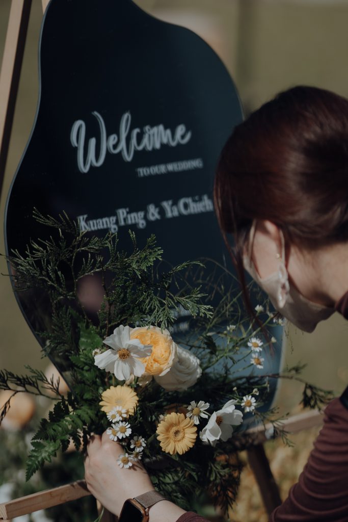 非常喜歡廣茜與婚佈Renee討論的婚禮佈置,佈置的風格跟我認識的廣茜有著相似的感覺,茜的個性就跟顏色鮮明的花一樣:亮麗有個性、有著可愛的大眼睛跟溫暖燦爛笑容;用苔類植物的綠色綜合著鮮明的顏色,像是廣平沉著穩重、帶著點害羞且溫柔的性格,整體給人感覺有朝氣,但又很沉穩的舒服感。